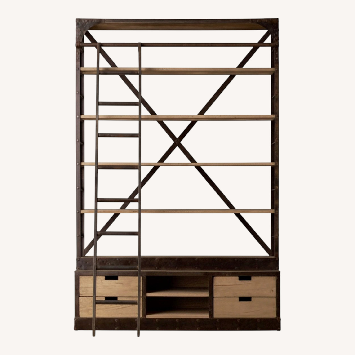 Industrial 1950s shelving that once organized tools and parts in a Dutch shipyard inspired our authentic reproduction. We replicated the original's exposed rivets, X-back bracing and moveable ladder, which, in years past, allowed the shipwright to access the lofty upper shelves. Crafted from solid walnut with fine veneers and brushed iron, its antiqued finish replicates an aged, worn patina.