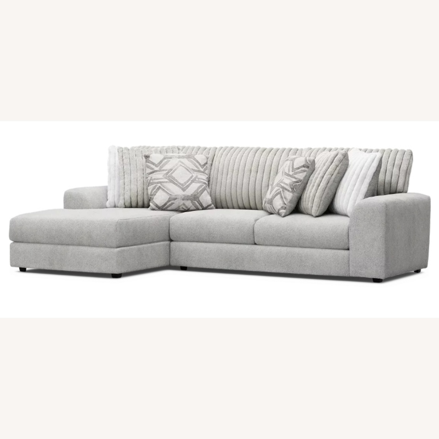 Cocktail hour style meets sleepover comfort with the Moreau Street sectional's easy charm. Transitional in style, this enticing sectional features a design that's equal parts stunning and fun, with gray scatterback cushions in an irresistibly textured ultra-soft fabric. Mingle with guests or get together with the whole family in complete comfort across two seats and a chaise, with low-profile padded wedge arms providing added coziness and flare. Plush, rounded seat cushions deliver indulgent relaxation and are also removeable and easy to clean. Coordinating pillows are included. Upholstery: 100% Polyester.