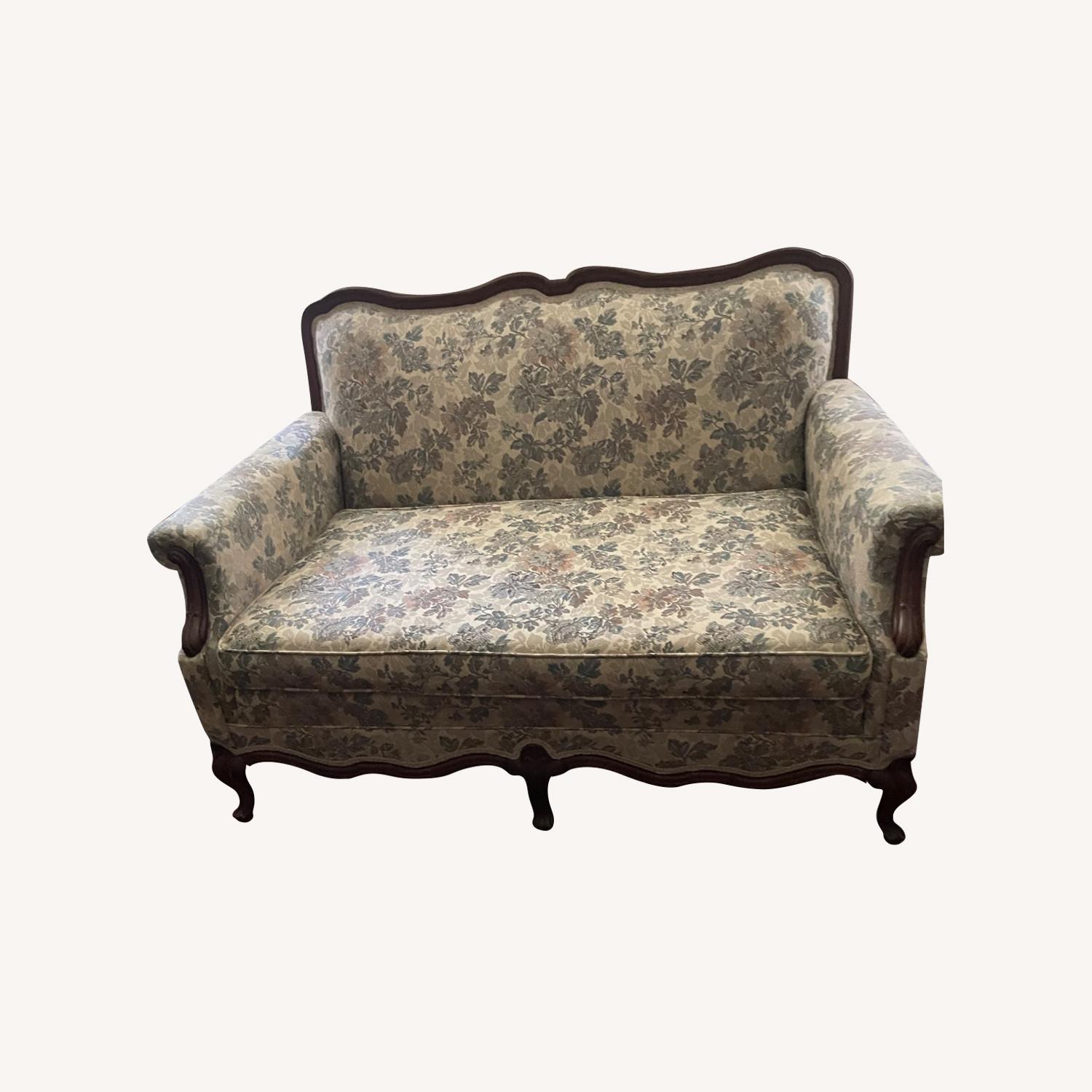 Seller's Notes:Purchased in an antique store years back. There isn’t a name brand mark on neither loveseats. They are a pair -two twin love seats. No stains and the fabric is in very good condition. They seat firm and very sturdy.