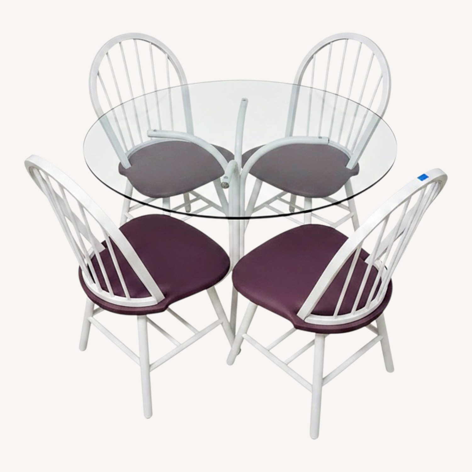 Seller's Notes:40" round glass top dining table with white piping base and four chairs/ purple seats. Some need cleaning.