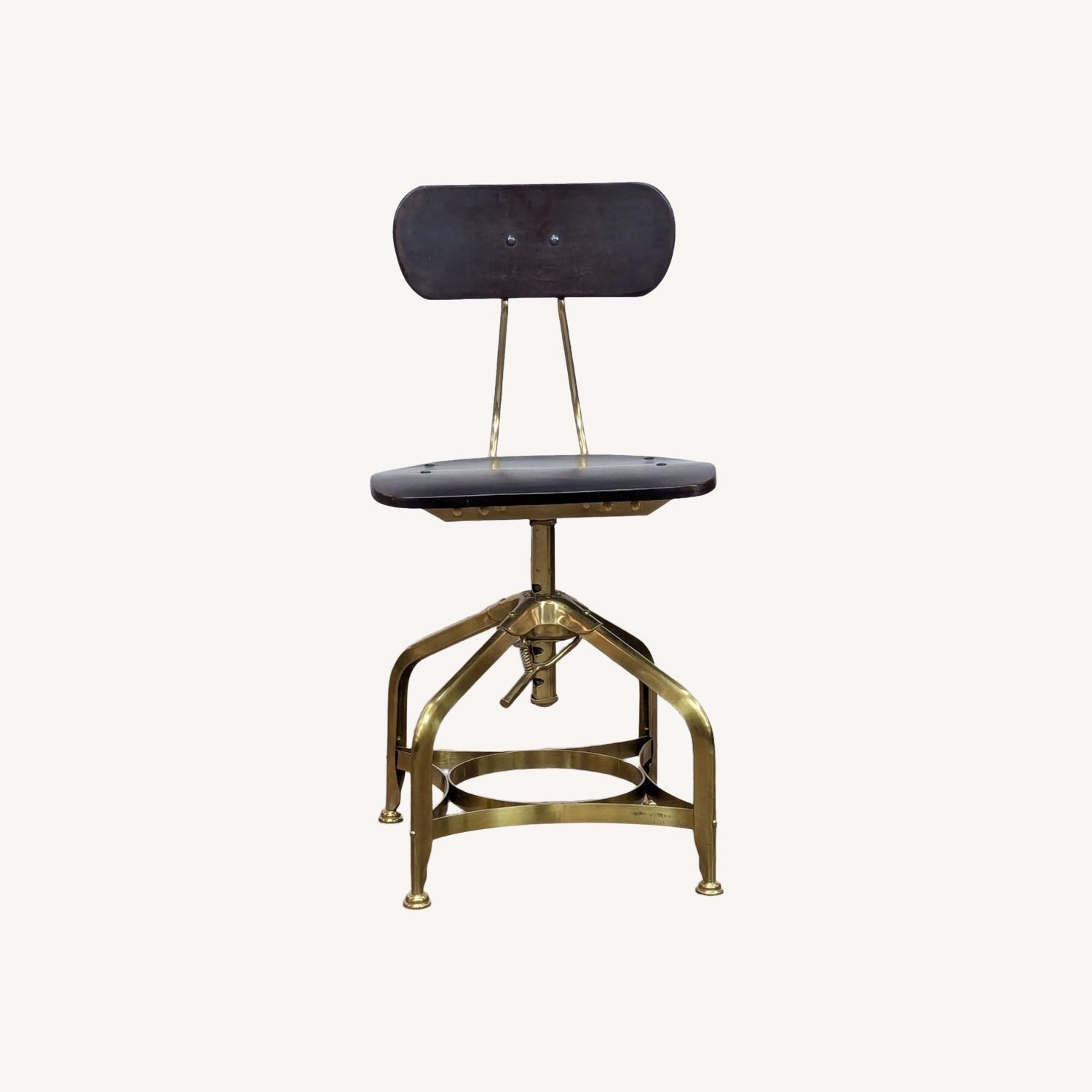 Seller's Notes:The Toledo Metal Furniture, Co. began as a bicycle maker in 1897 and was founded by the brothers Joe and Clement Uhl in Toledo, Ohio. After the dawning of the automobile, with bicycle demand dropping, the Uhl’s began producing furnishings for commercial and industrial use in about 1910. This chair is a reproduction of the classic vintage-inspired draftsman’s chair. It pairs industrial styling with the warmth of wood seating. The bent steel base is constructed with a spring-loaded clamp and steel pole for height adjustment. The chair’s back adjusts separately, and the seat features a swivel mechanism. This version is in a brass finish.