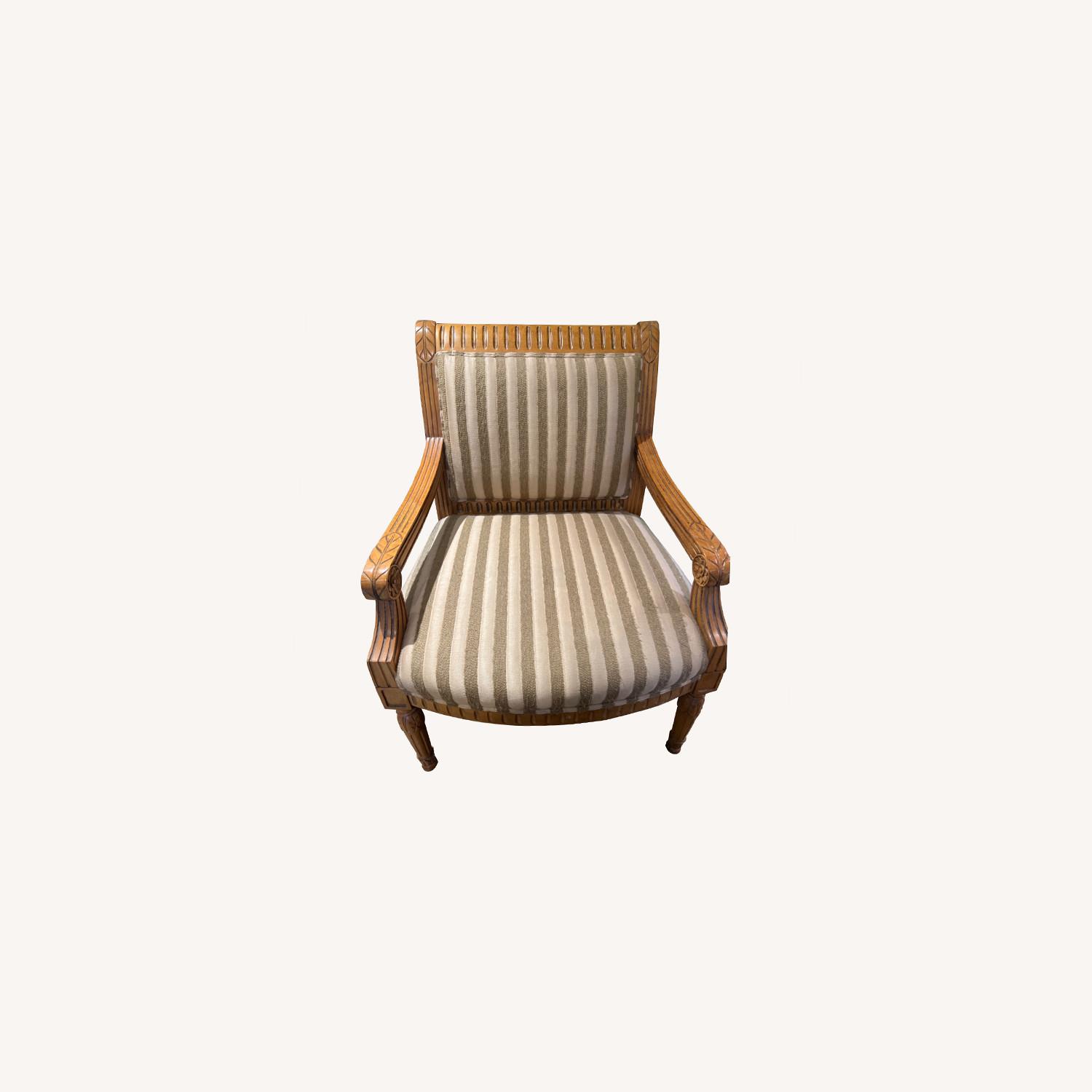 Seller's Notes:Condition is very excellent. Fabric is raw silk with chenille stripes. Chair is very strong and sturdy. Beautiful accent chair.