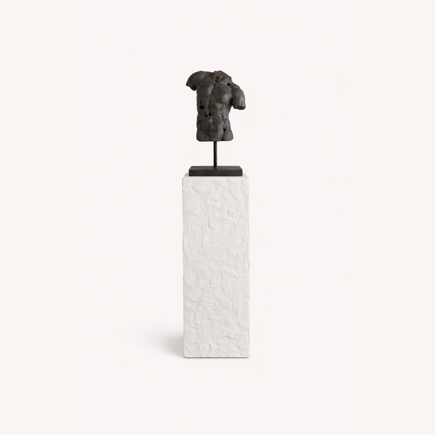 Seller's Notes:Striking abstract torso sculpture paired with a hand-finished plaster pedestal. The sculptural form features a dark, textured surface with organic cracking, creating a dramatic contrast against the light, monolithic pedestal.