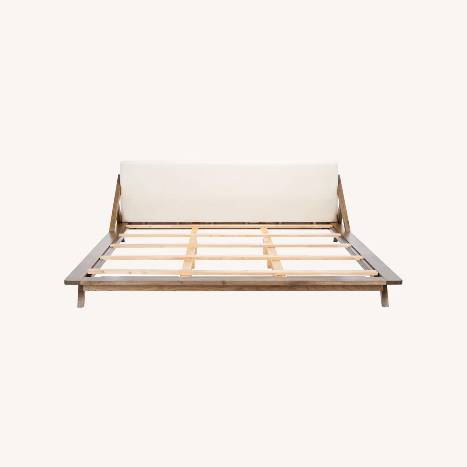 Mid-century charisma meets contemporary chic in this solid wood and upholstered low-profile platform bed. With a touch of rustic charm in its finish, angled frame, splayed legs, and a plush cushioned back to speak to any design style, it is the perfect piece for any bedroom.