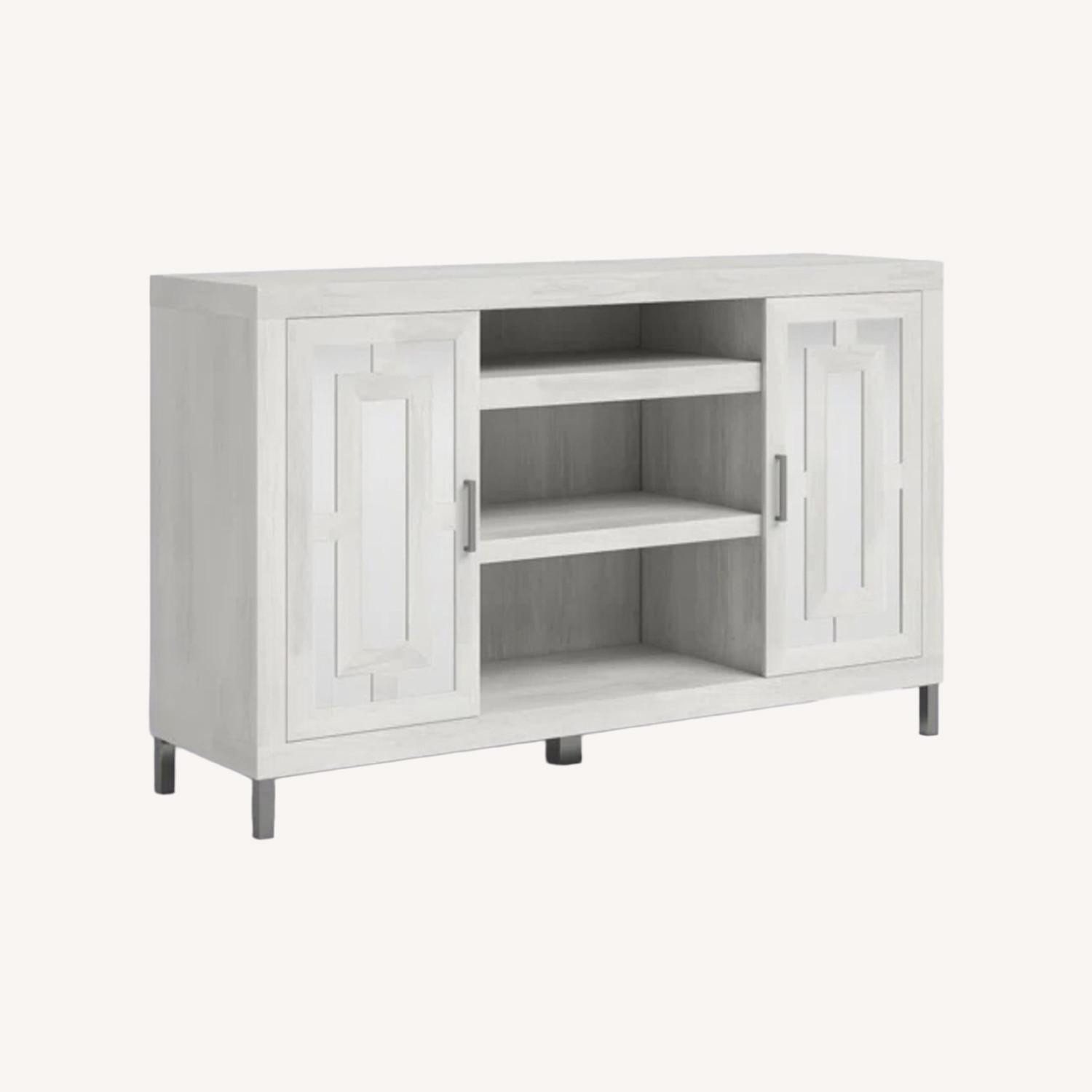This versatile TV stand brings coastal and glam style to your living room or bedroom. Its 60" wide frame is crafted from engineered wood with a neutral or weathered finish of your choice. The front of this piece features two glass cabinet doors with decorative mullions on the front for a hint of depth. Behind the doors, there's adjustable shelf space to tuck away books, games, and DVDs. Plus, three open middle shelves are ideal for displaying a game console, cable box, or a few succulents. This TV stand also has cable management in the back to keep wires organized. Hand-curated by Kelly Clarkson.