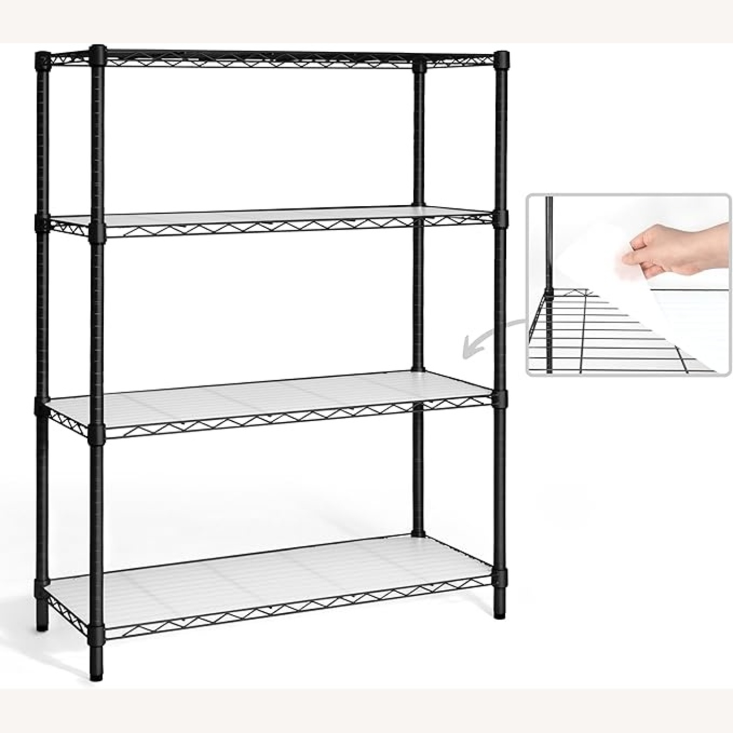 Perfect Size With Strong Weight Capacity – 36”L x 14”W x 54”H. This 4-tier wire shelving can fit your place perfectly. It provides lots of storage capacity without taking much of space, if you are looking for a trustable partner to keep your place organized and neat, this metal storage shelving will be your best choice. Sturdy and Durable Heavy-Duty Material - NSF Certified, made of high quality steel with black paint coated. With strong leveling leg, it provides the best of both rugged reliability and modern appeal. Durable and resistant to dirt buildup and corrosion, the smooth coating makes it effortless to clean. Each tier shelf holds up to 250 lb when evenly distributed, the total max weight capacity is 1000 lb. High Quality 0.6MM Liner – Provides a smooth, flat surface for your things! Place the liners on each shelf to get a better storage for books, hardware parts, keys, toys… all the small objects! We use high quality BPA-free plastic, which is safe and friendly to our planet. With these waterproof liners, your small items will no longer fall through the cracks, and you don’t have to worried about the liquid spills.