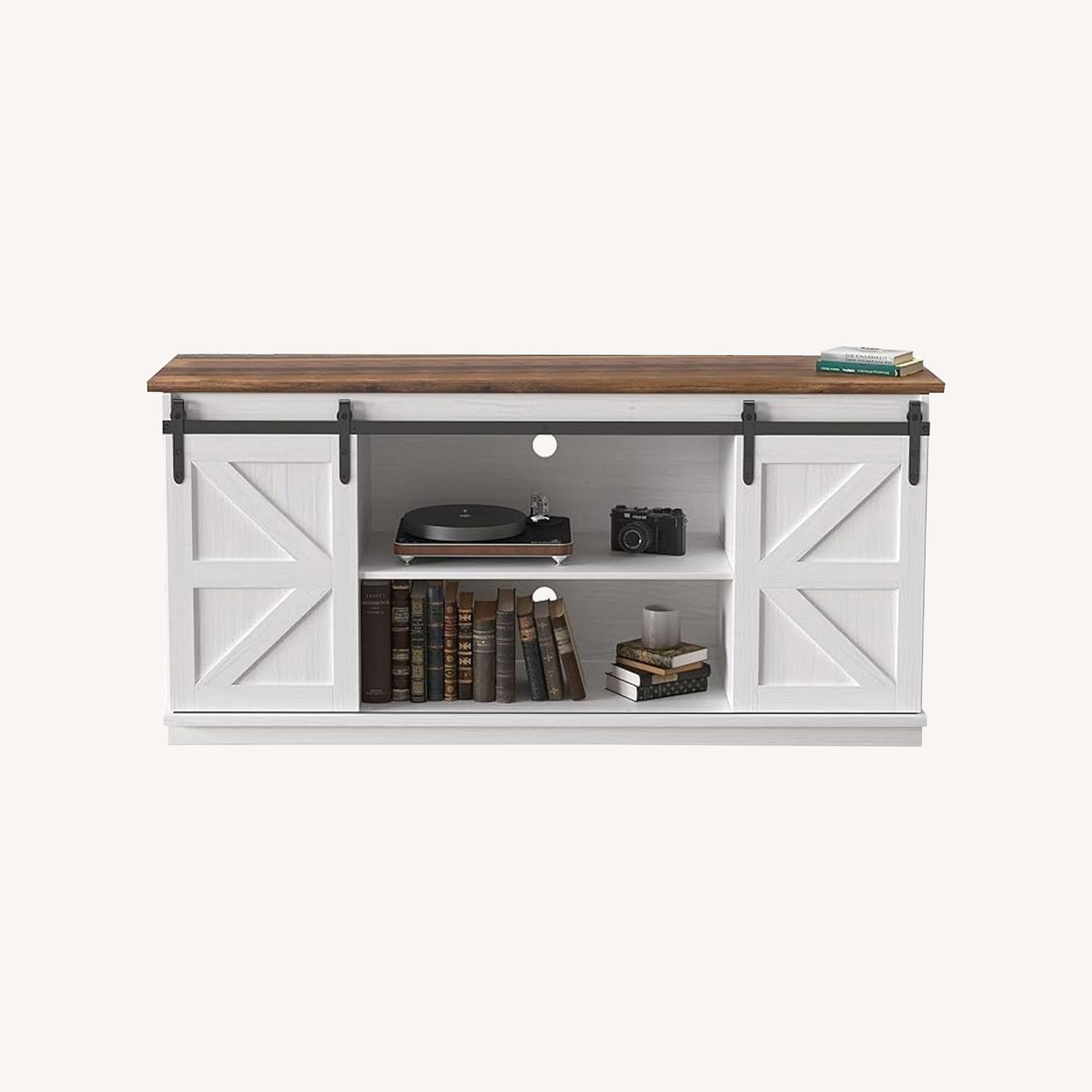 Seller's Notes:Gently used Jummico TV Stand for 65 inch TV. Entertainment center with sliding barn doors, mid centrury modern.