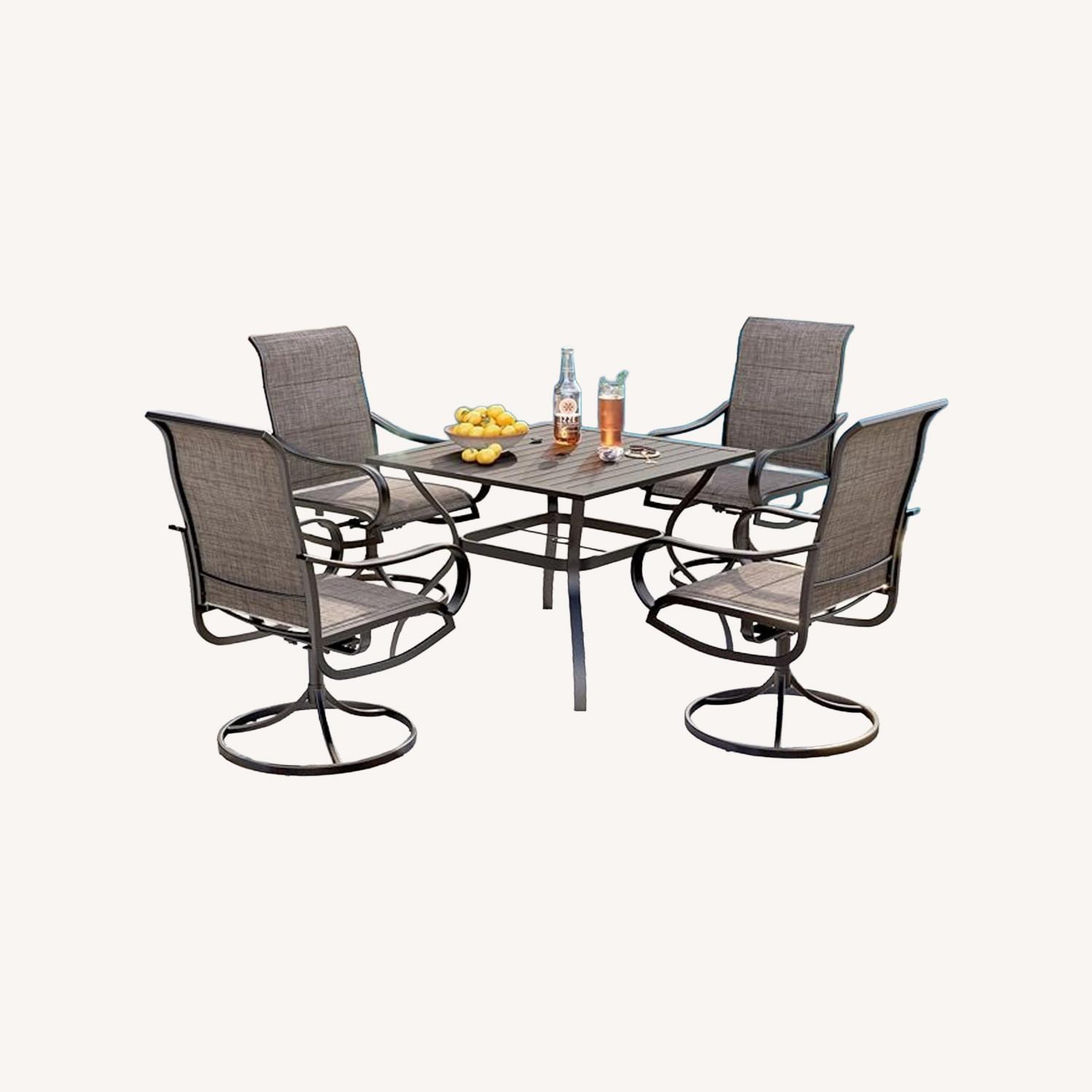 Seller's Notes:ColorPadded Brown Chair BrandPHI VILLA Size37"W x 37"D x 28"H StyleClassic Assembly RequiredYes ShapeSquare Premium Meterial: The frame of the table and chair is made of premium metal steel materials, durable. And holds up to 250 lbs, weight capacity for long-lasting use. The surface of the frame is e-coated, rust-resistant Padded Back & Seat Design: Breathable sling fabric padded with fast dry foam on wide seat and high back add extra ease and comfort for your outdoor life More Fun & Relax: The 360-degree rotating chair and gentle rocking can bring more fun to your life. And it is more suitable for leisure or dinner time Patio Table with Umbrella Hole: The simple and classic black table has always been people's favorite. In addition, there is an umbrella hole, give you more choices Demension & Service: Chairs: W 19.5" x D 20" x H 40"; Table: 37"W x 37"D x 28"H