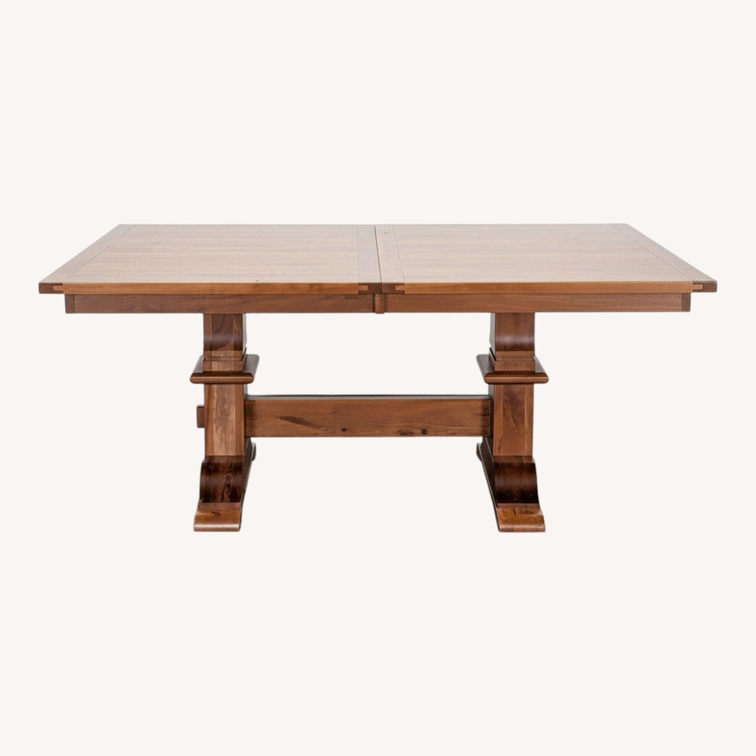 Seller's Notes:Trestle table with 2 leaf inserts expanding to 104.25 inches. Leaves self-store within the table
