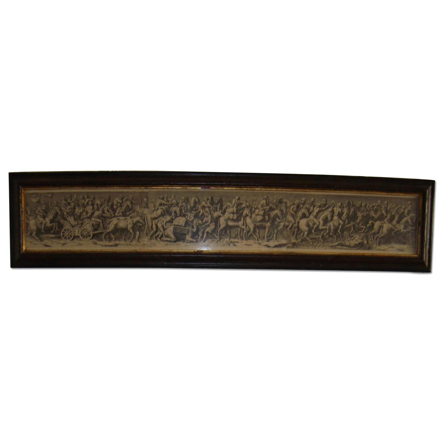 Seller's Notes:This is an unusual unique sized framed engraving. Also, This is an antique frame, beautifully done. The 3 original engravings are side by side. History and description is on back. These original engravings, not printed copies are very hard to come by, if at all possible. This particular engraving is apx 4' 3" by 11" including frame.