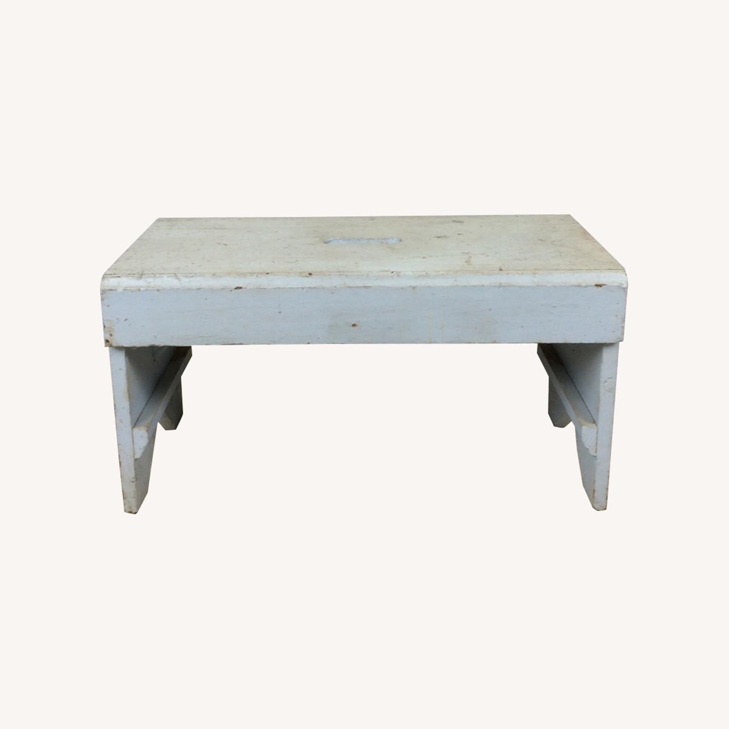 Seller's Notes:This antique farmhouse style bench footstool features hardwood construction, original gray painted finish, primitive legs and feet, and a carved handle in the top. Dimensions: 25w 13d 13h Condition notes: Original light gray painted finish has some chipping, staining, discoloration from age and regular use. This stool/bench is VERY sturdy and solid. They don't build them this solid any more. 8.5/10