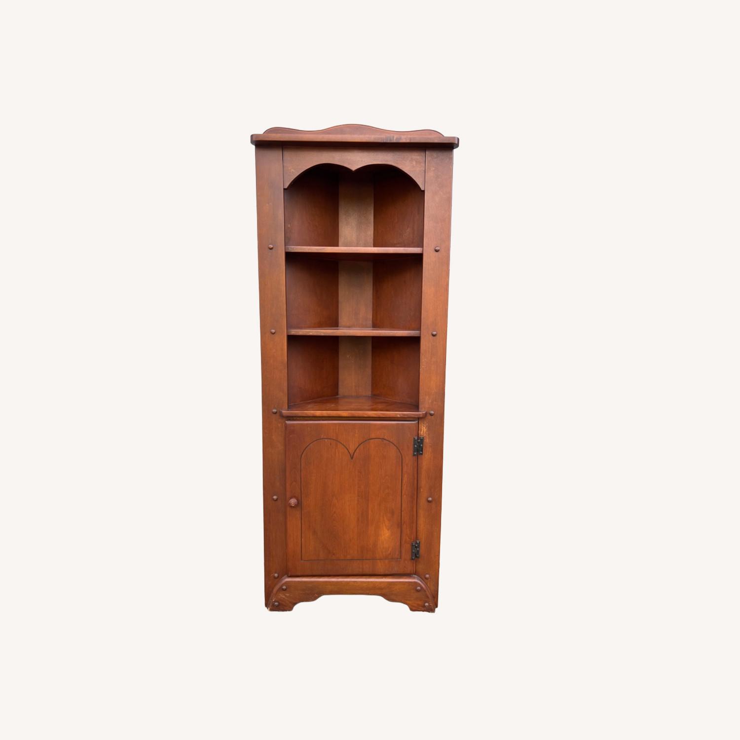 Seller's Notes:This antique farmhouse style corner cabinet features solid maple construction with original finish, three opened shelves up top, cabinet with carved detailing and wooden pull below, cabinet contains an additional shelf. Shelf dimensions: 17.75w 10.75d 10h Dimensions: 25.5w 23d 65h Condition notes: Original finish is in excellent condition with only small scuffs, slight scratches, and minor edge dings consistent with age and regular use. Door hinges open and close properly. Cabinet door latches correctly to remain closed. 8.5/10