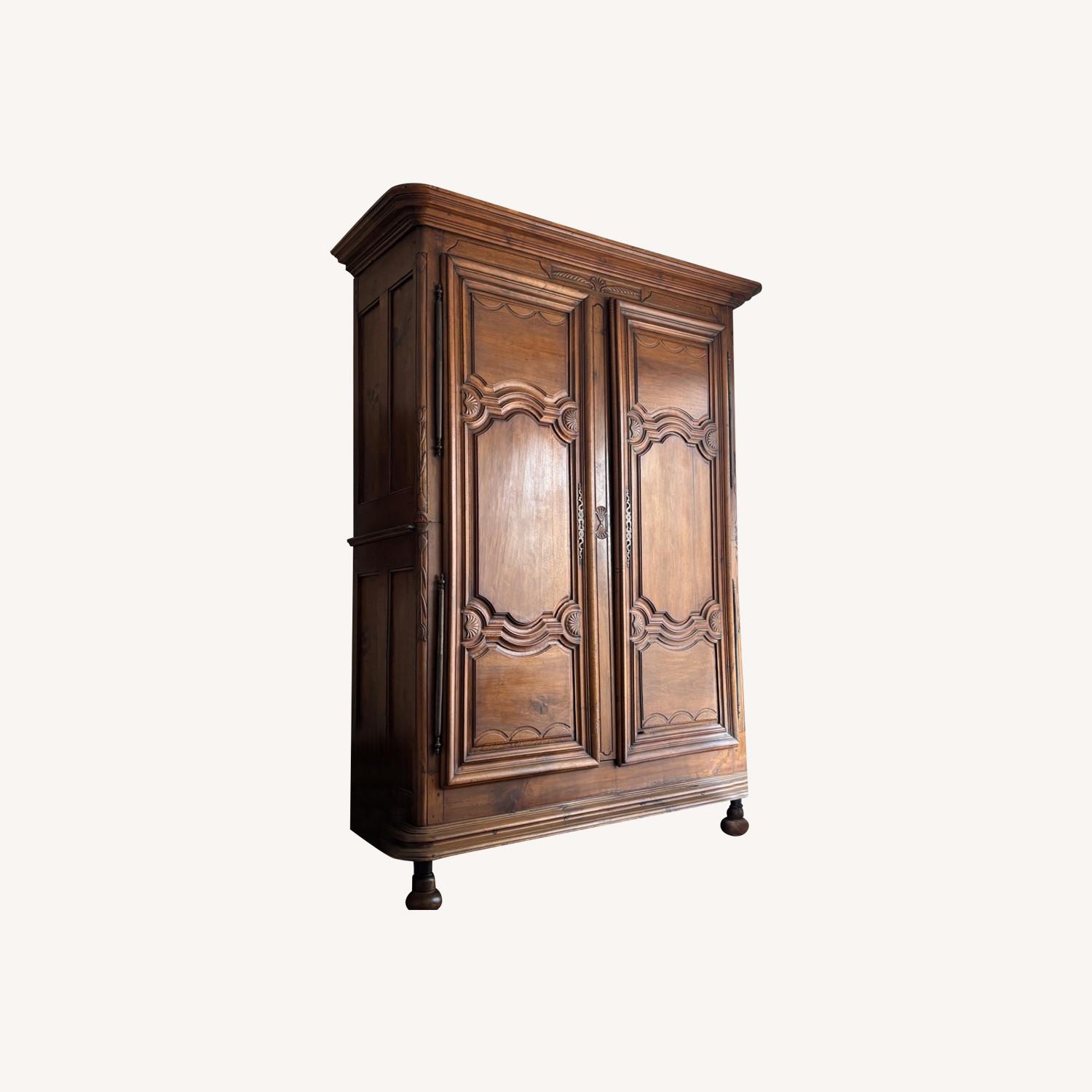 Seller's Notes:This Armoire is Antique, the exact age is unknown. It is solid construction and well made. It is made of heavy solid wood. APPROX MEASUREMENT H- 89 1/2” W- 63” D- 26 1/2” It was delivered in several pieces that were held in place by the original pegs, for ease of transport. No screws or bolts. 1- bottom section 2- top section 3- topmost crown (molding) 4- 2 doors 5- 2- interior shelves No key for lock It is solid wood (type unknown, brand unknown) extremely heavy wood. Solid well made construction.