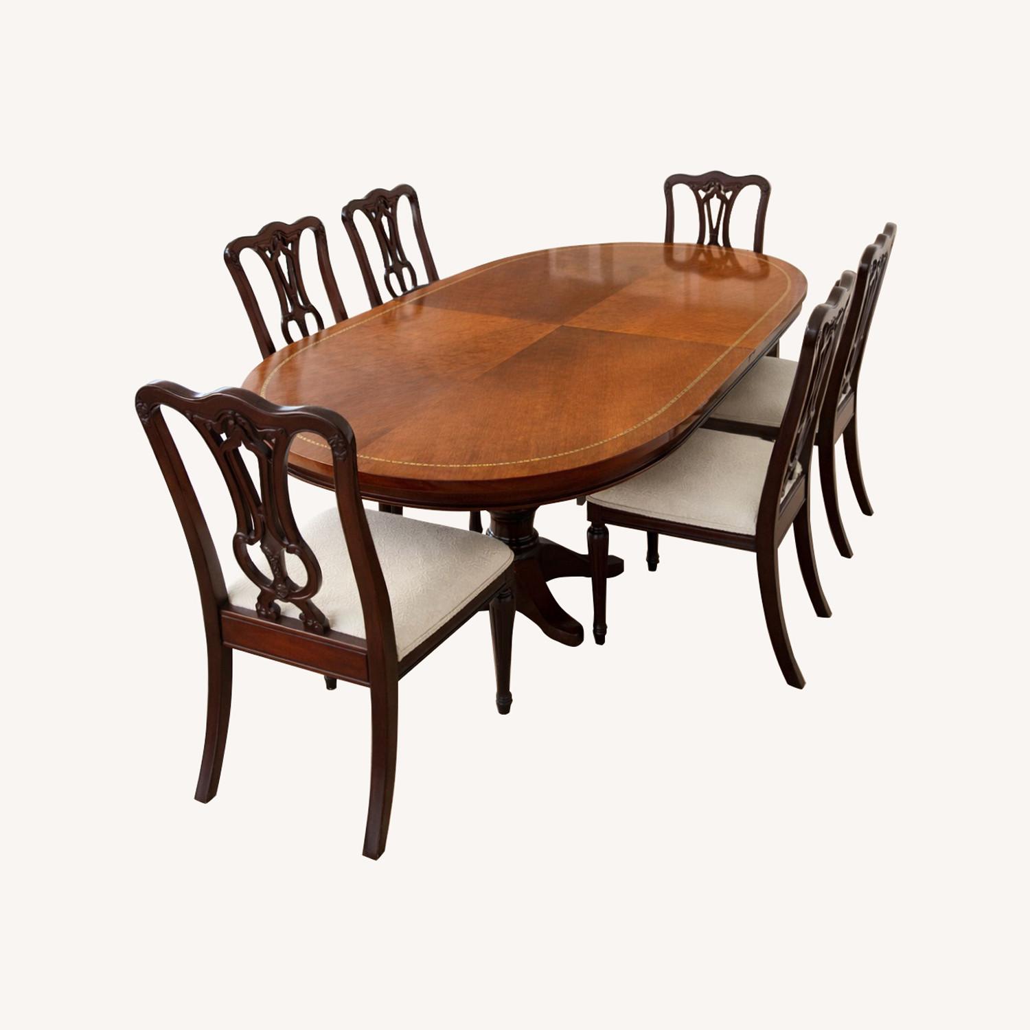 Seller's Notes:This elegant antique dining table is a finely crafted piece, made from richly toned hardwood with a warm, polished finish that highlights the natural grain. The oval top is bordered with delicate inlay detailing, a subtle touch that reflects thoughtful craftsmanship without excess ornamentation. The table is accompanied by six matching chairs, each with graceful lines and carved backs that echo the table’s classic proportions. Together, the set feels balanced and substantial—designed for real use, not just display. This is a versatile set that bridges traditional and contemporary spaces with ease. It works just as comfortably in a modern, light-filled dining room as it would in a more classic interior, offering warmth, character, and timeless appeal.
