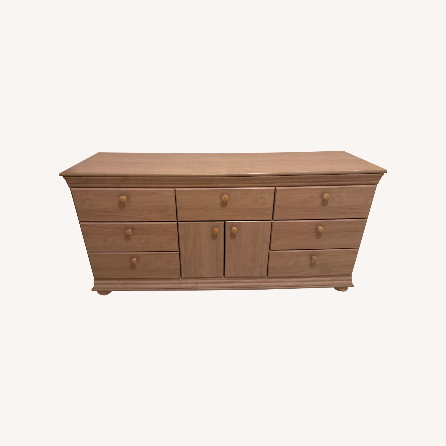 Seller's Notes:Ample storage in this dresser with 7 drawers and 1 cabinet with doors that open up for all your needs. This diverse item can also serve as a credenza or media table if wanted.