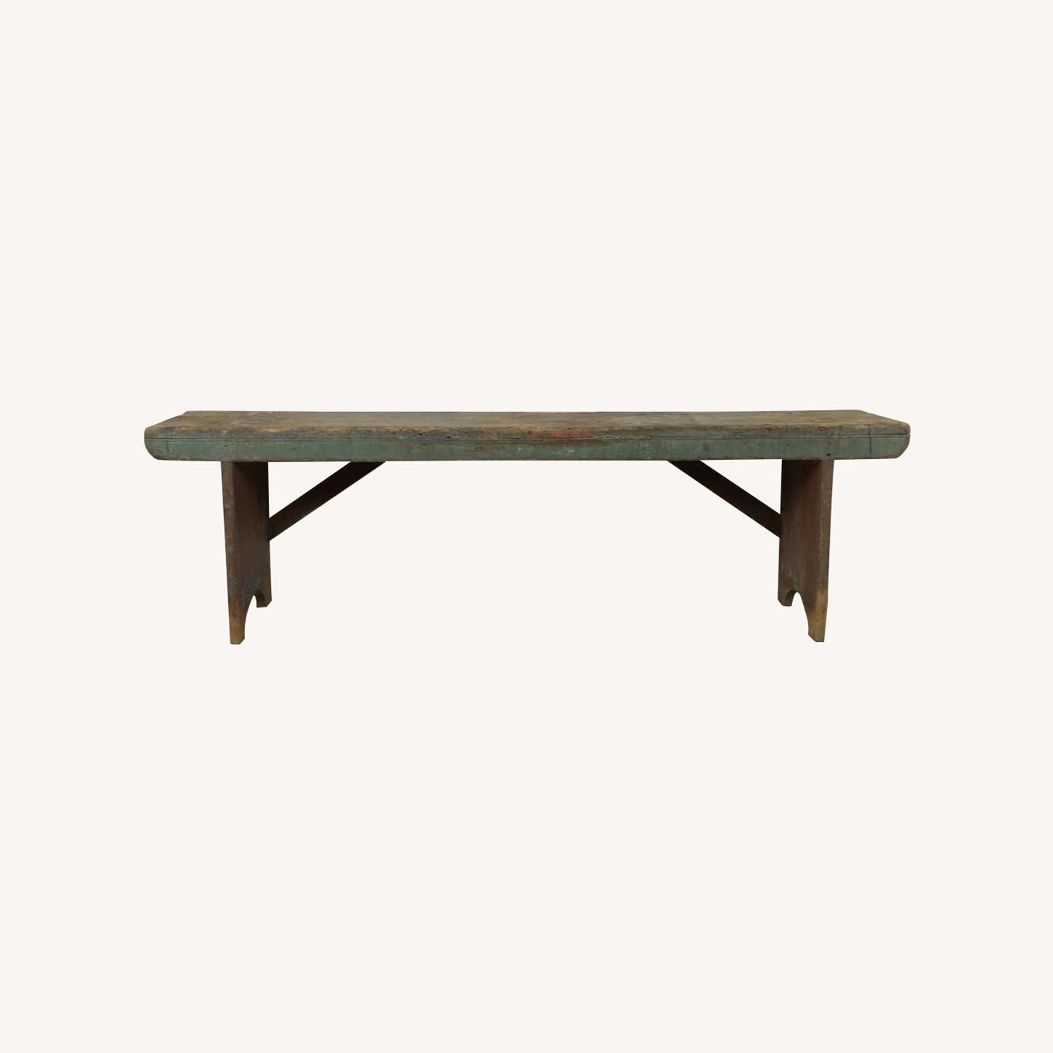 Seller's Notes:This antique Farmhouse style bench with features hardwood construction, multi-colored paint in varied stages of wear and fading, solid wood feet with additional added cross supports. Dimensions: 65.75w 12.25d 19.5h Condition notes: This antique bench is in excellent condition considering its age. Very sturdy. Added cross-supports strengthen the already sturdy construction. Paint on feet and sides is fading, worn. A beautiful patina. 8/10