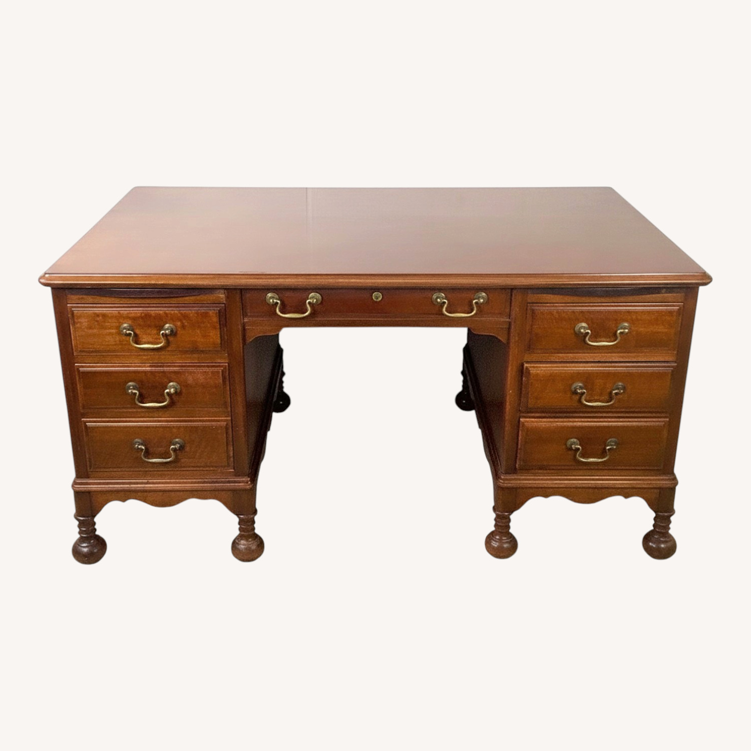 Seller's Notes:A handsome and well-made antique kneehole pedestal desk in the Queen Anne revival style, produced in the 20th century. The piece presents the full formal vocabulary of the style with quality and care: richly figured burl walnut veneer drawer fronts, original cast brass bail pull hardware with lovely aged patina, a shaped scalloped skirt, and well-turned bun feet. A fitted glass top protects the work surface. This is a desk of genuine antique character and substantial decorative presence. The case follows the classic kneehole format — two banks of three drawers flanking a central opening, with a full-width frieze drawer at the top. Every drawer front is veneered in burl walnut, its swirling figuring providing strong visual interest across the face of the piece. The brass bail pulls are period-appropriate and original. The scalloped skirt below the kneehole and the paneled back (finished in matching walnut veneer) both indicate quality production designed to be seen from all angles in a room. The bun feet are correctly proportioned and well-turned — a detail that distinguishes quality revival production. No maker's markings are present, consistent with American and English decorator-trade cabinetmaking of the interwar period. The condition is consistent with honest age: the burl veneer and brass hardware carry the warm patina of genuine use over decades, and the structural integrity of the piece is sound throughout. Works beautifully as a home office desk, writing desk, vanity, or statement piece in a library or study. Pairs naturally with traditional and antique furniture of all periods, as well as with maximalist and eclectic contemporary interiors that benefit from a note of historical weight and warmth. The glass top is practical and can be removed if preferred. Dimensions: 60w 36d 31h 25x25 knee hole Condition: age appropriate wear, vintage finish worn, scuffs/scratches, edge wear, dings/chips, discolor, interior marks, no key, see photos.