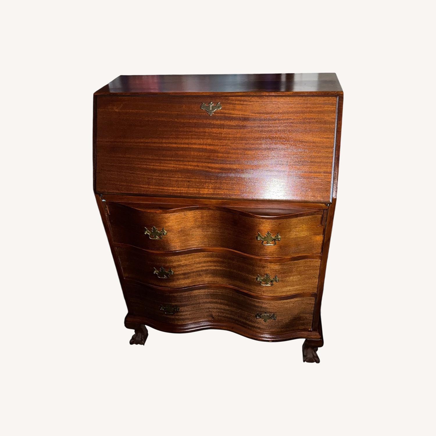 Seller's Notes:This is a gorgeous antique secretary desk that has been a cherished part of my family for years. It's a classic piece with a drop-down front that opens up to a functional desk space, complete with several small cubbies and drawers for organization. The wood has a beautiful deep reddish-brown color, and the front drawers have a lovely curvy shape. It stands on detailed "claw and ball" feet, which give it a lot of character. The brass handles and keyholes are all original and have a nice vintage patina. This desk is perfect for a home office, a living room, or even a cozy bedroom nook. It provides plenty of storage space and a convenient writing area when needed. It's sturdy and has been well-cared for. There are some minor signs of age, like a few small scratches or a little discoloration, but these are just part of its history. We're sad to see it go, but we're moving and it no longer fits our space." Dimensions: * Width: 25 inches * Height: 40 inches * Depth: 15 inches