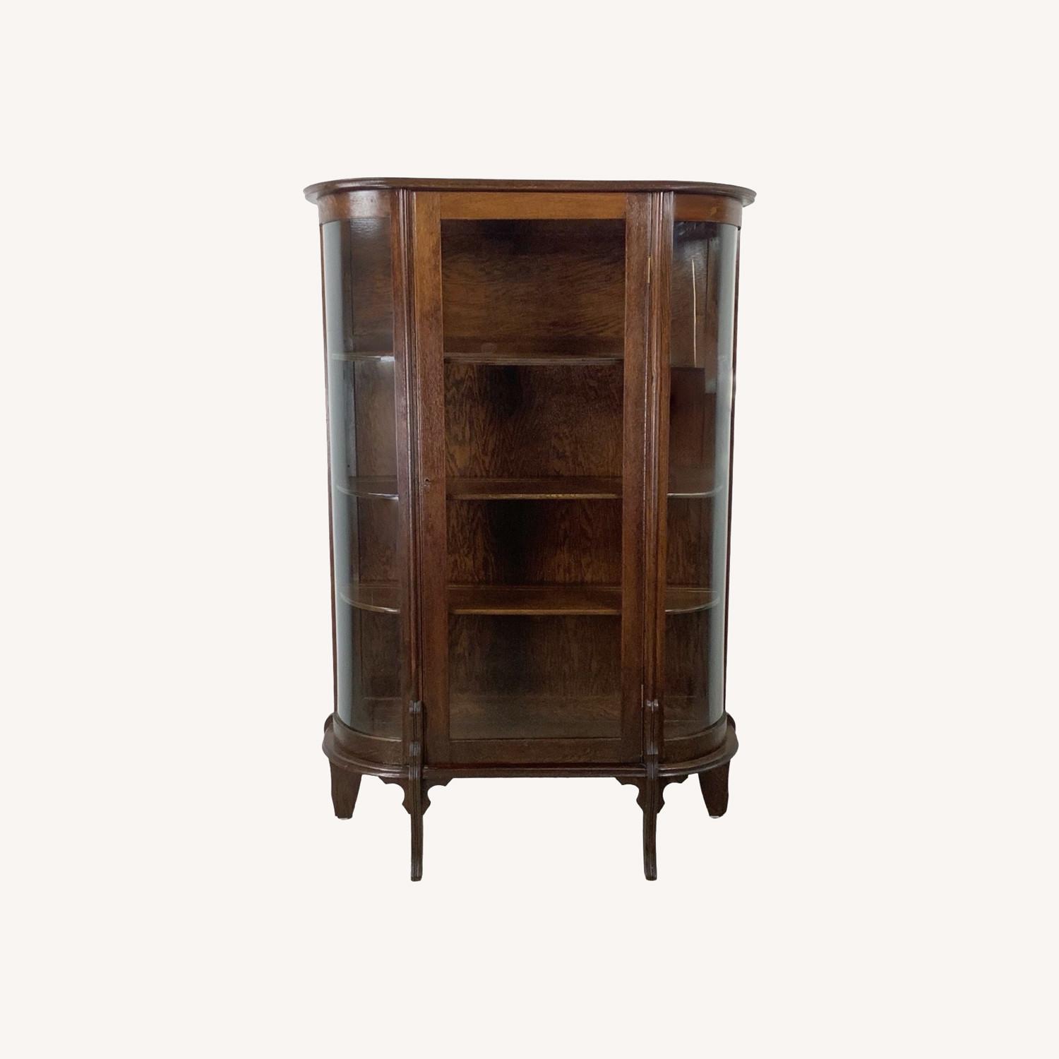 Seller's Notes: This antique display cabinet is defined by its curved glass sides and bowed front, a form that reflects careful craftsmanship and an emphasis on visual elegance. The curvature softens the cabinet’s presence while creating a sense of movement and depth. The wood frame features clean vertical lines that anchor the design, providing structure and contrast to the glass panels. The proportions feel deliberate, giving the cabinet a refined and well-balanced appearance. Inside, open shelving allows for versatile display, whether used for china, books, or collected objects. The glass panels ensure visibility from multiple angles, enhancing its role as a true display piece. The cabinet rests on slender, tapered legs that elevate the case and contribute to its light, graceful stance. Subtle shaping at the feet adds a finishing detail without distracting from the overall form. Suitable for dining rooms, living spaces, or entry halls, this cabinet offers both functionality and decorative presence. A classic antique display cabinet that blends form, craftsmanship, and timeless design. Dimensions: 40w 13d 60.5h Condition: age appropriate wear, vintage finish worn, scuffs/scratches, edge wear, discoloration, chips, interior marks, see photos.
