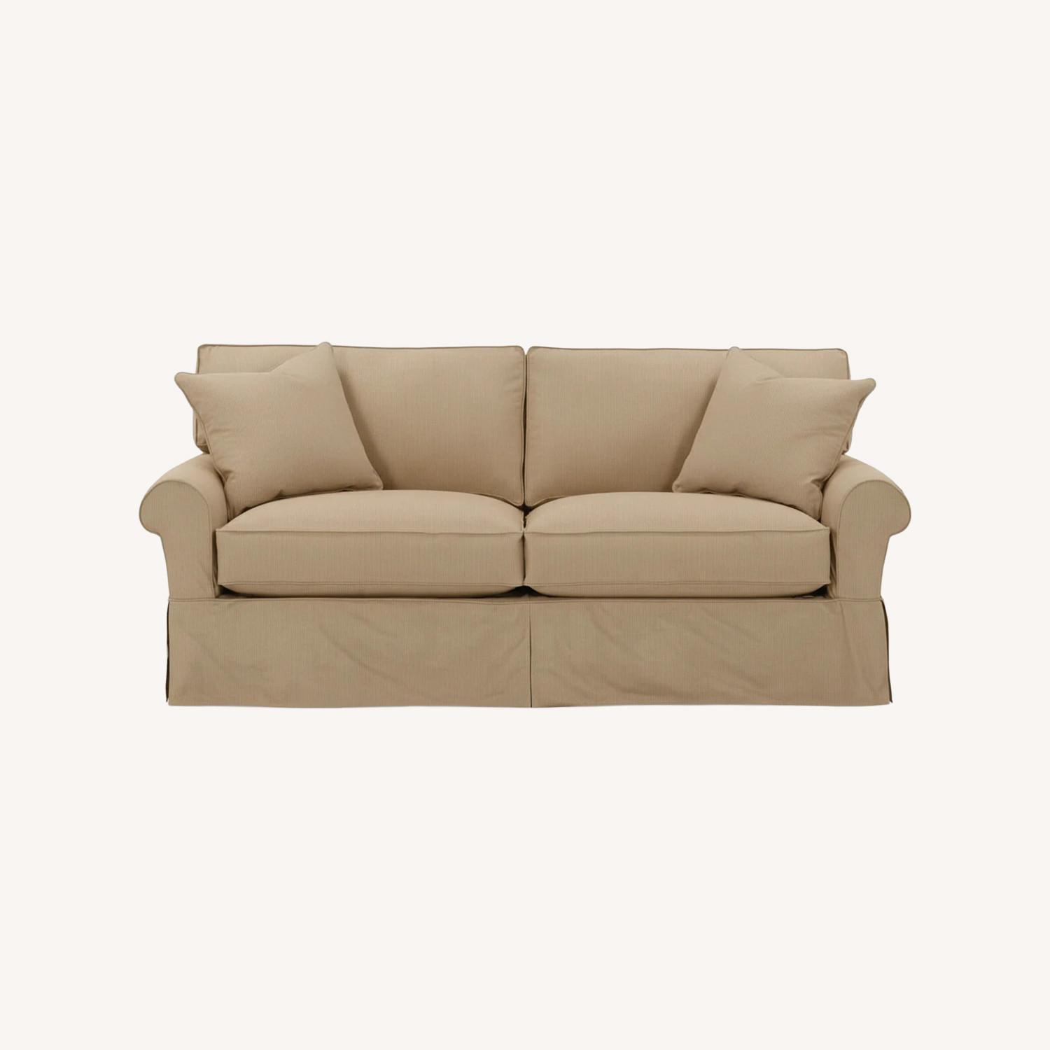 Seller's Notes:Home sofa/sleeper from Arhaus. Some scratch damage from cats on original armrest fronts. Comes with Desert Natural slip covers and two pillows.