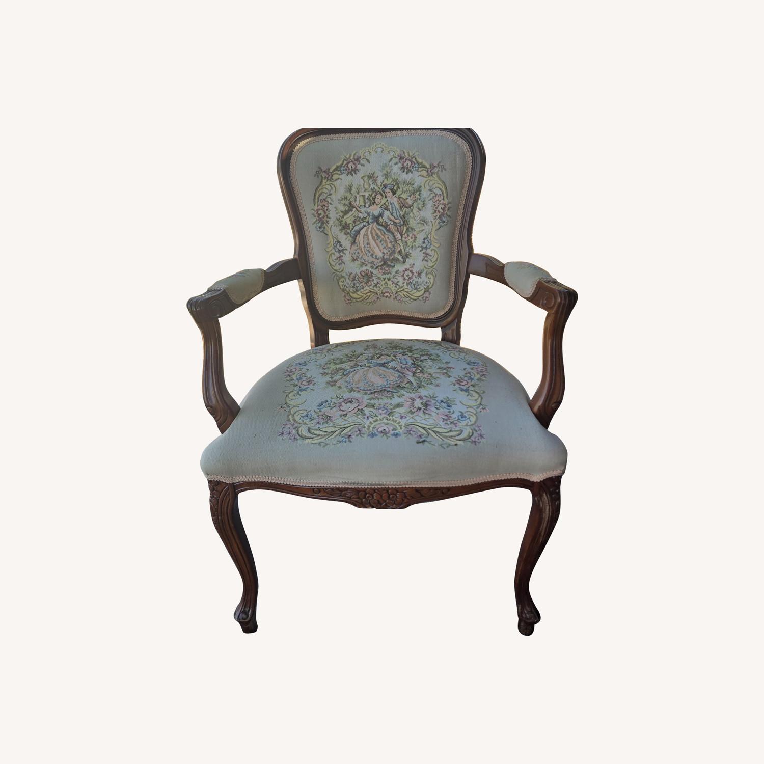Seller's Notes:Wooden armchair with French Rococo-style tapestry upholstery featuring courting couple scenes. This armchair features Louis XV-style design elements with petit point or needlepoint tapestry upholstery depicting pastoral courting scenes, popular in French Rococo aesthetics. The wooden frame shows curved lines characteristic of the Louis XV period, though this appears to be a 20th century reproduction. Such decorative chairs became fashionable as statement pieces in traditional and formal living spaces. Collectors and enthusiasts of French provincial or Rococo revival furniture particularly value these pieces for their romantic imagery and ornate craftsmanship. The tapestry work depicting idealized pastoral scenes connects to the broader tradition of European decorative arts that celebrated aristocratic leisure and romance.