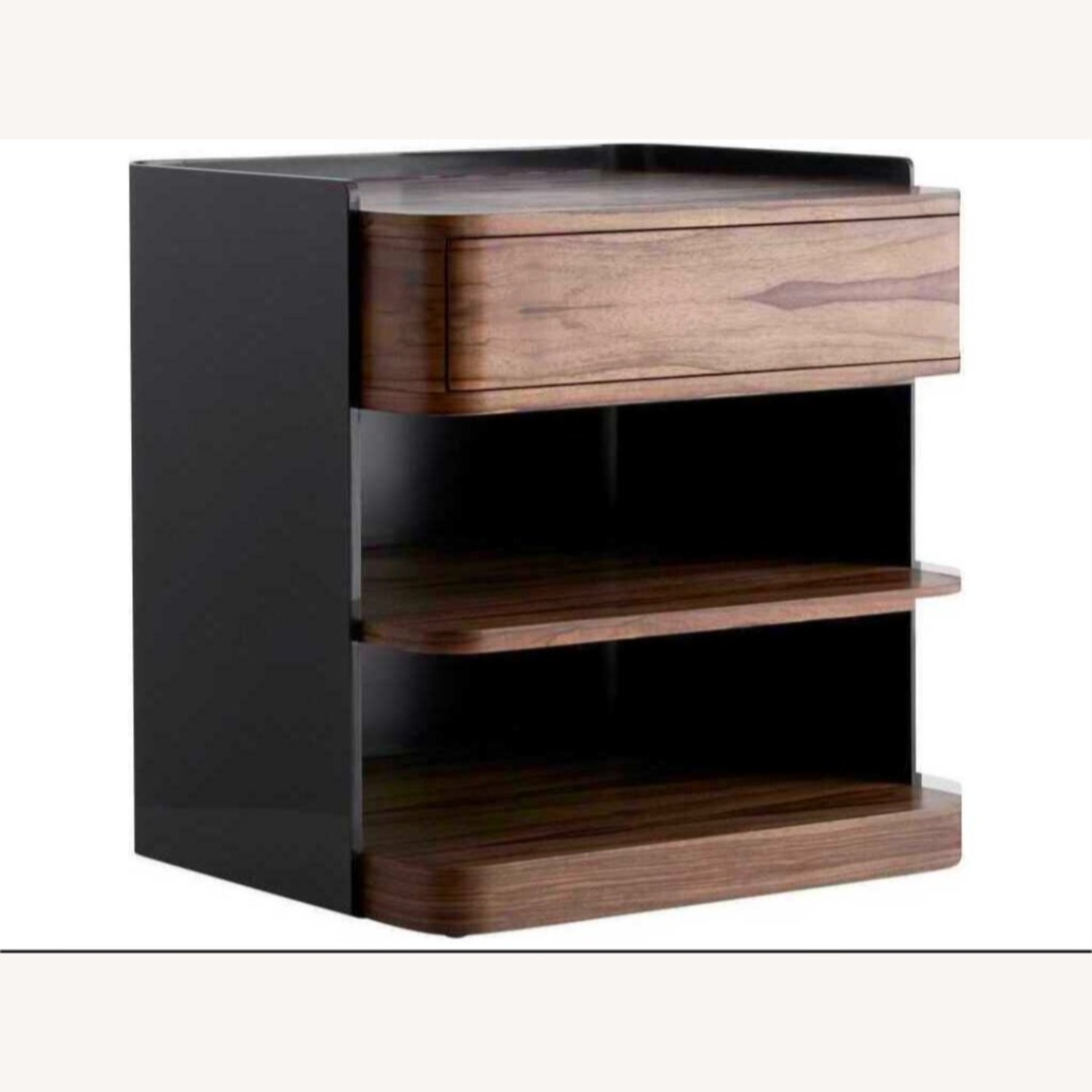 Seller's Notes:Crafted from ofram veneer (a rare wood) in a chateau gray finish supported by a charcoal lacquer cuff-style wrap. The table has a press-to-open top drawer and two open spaces for storage.