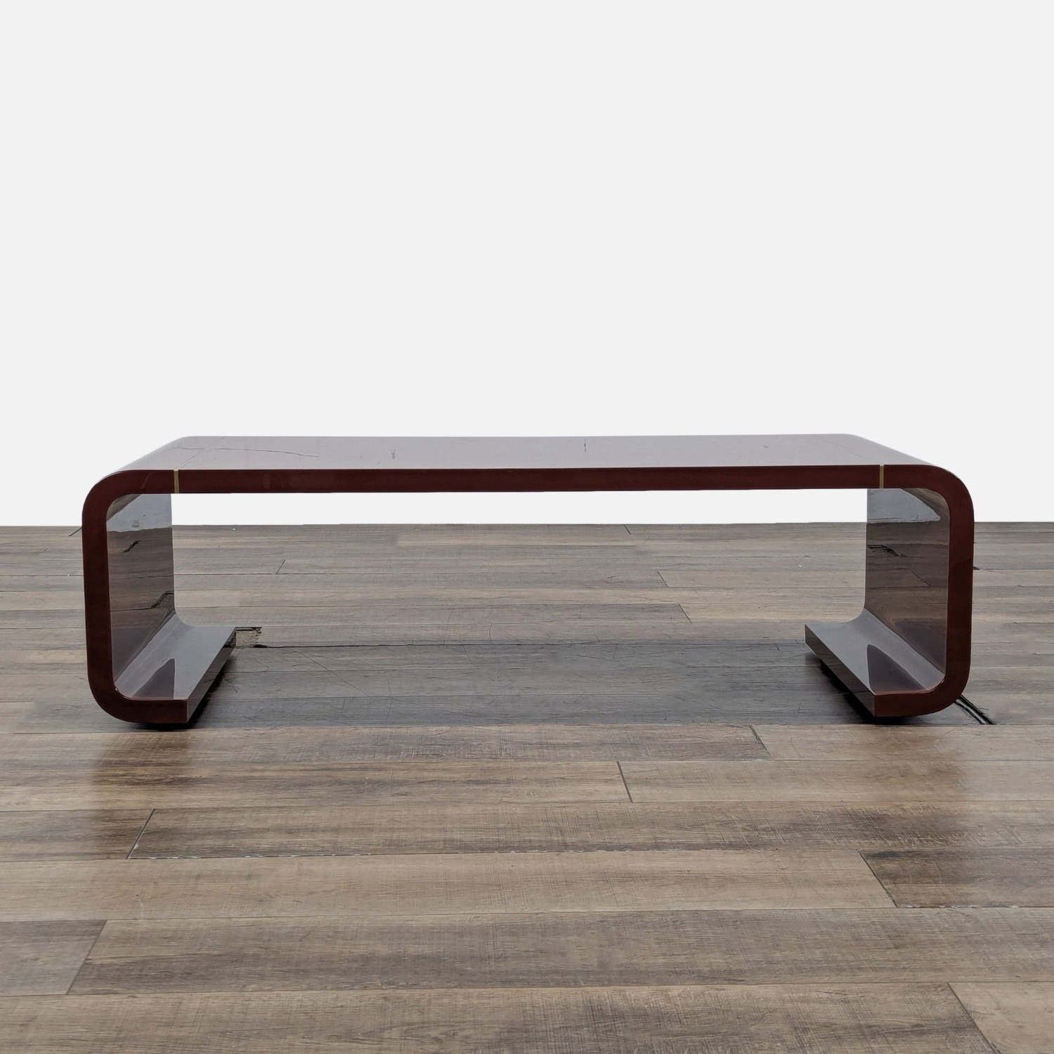 Seller's Notes:Rich paprika lacquer finish with thin antique brass inlay edge. The angular shape of the legs breaks away from the traditional scroll leg