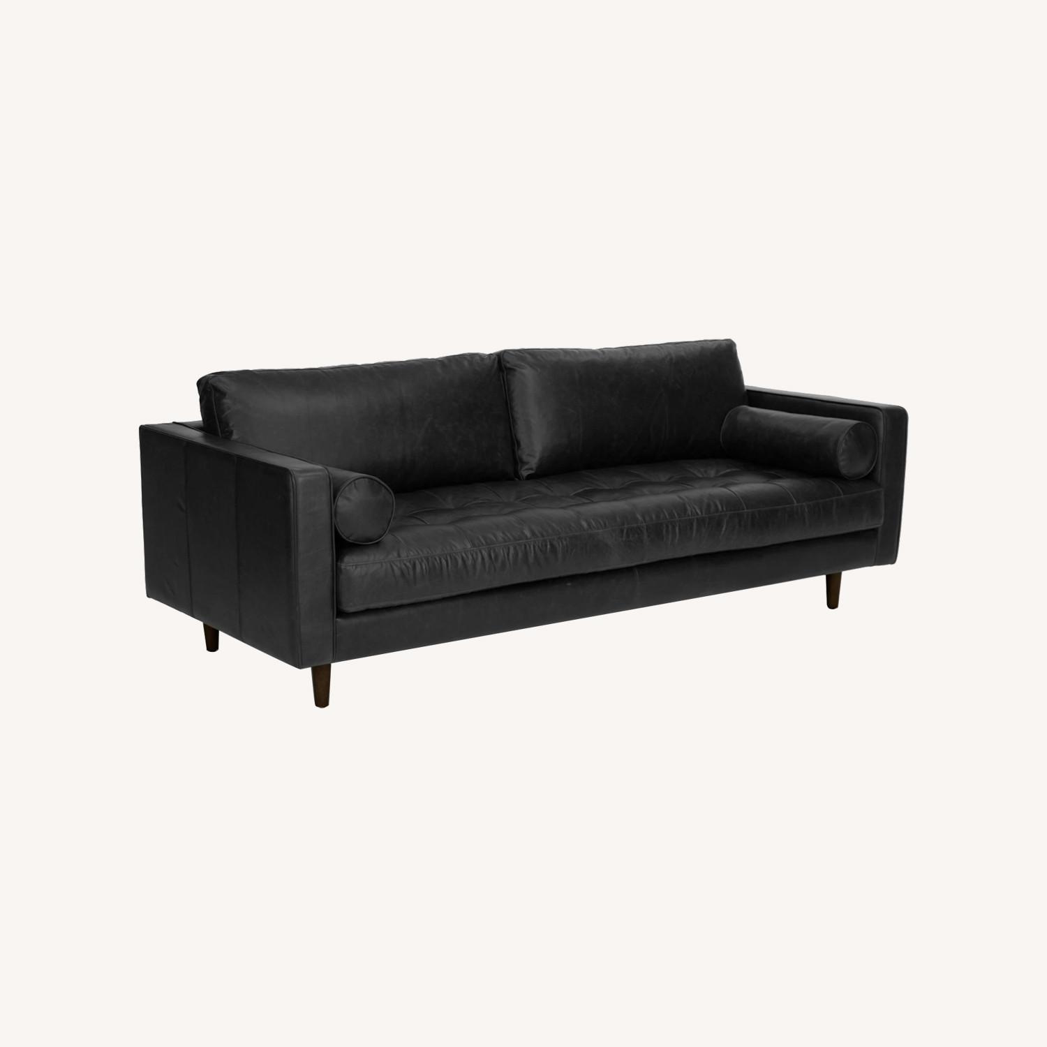 Casually sexy. The Sven in oxford black is equal parts laid back and intimidatingly hot. This black leather sofa is built on a corner-blocked wooden frame and upholstered with supple semi-aniline leather. Slender walnut legs, a tufted bench seat, and loose back and bolster cushions make for a sofa that is pulled together, but ready to get a little rowdy too. Add some sensual energy to your living space. Meow. Natural color variations, wrinkles and creases are part of the unique characteristics of this leather. It will develop a relaxed vintage look with regular use.