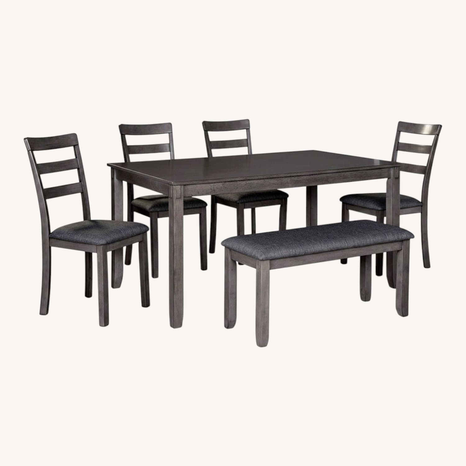 It’s so easy being gray—at least the Bridson 6-piece dining set makes it seem that way. This transitional dining table set sports a charcoal gray finish with textured gray upholstery for an on-trend and relevant appeal. Plushly upholstered seat cushions in a practical polyfiber make it a pleasure to linger at the table. Brilliantly styled seating choices add interest and versatility at mealtime. Includes dining table, bench and 4 dining chairs Made of wood, veneer and engineered wood Medium charcoal gray finish Ladderback chairs Cushioned seats covered in textured gray polyester upholstery Table with tapered leg design Assembly required Expert assembly recommended; available at check out for an additional fee Excluded from promotional discounts and coupons