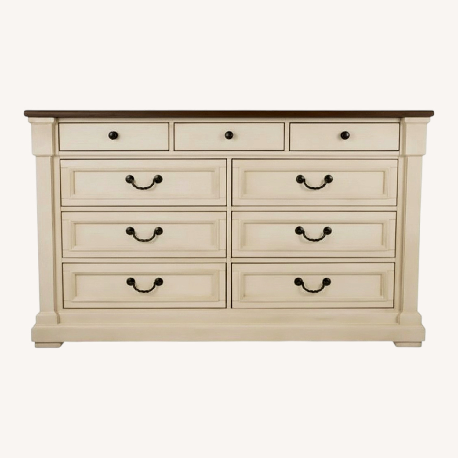 Seller's Notes:Whether your style is farmhouse fresh, shabby chic or country cottage, you’ll find the Bolanburg dresser and mirror dressed to impress. Its two-tone, gently distressed finish pairs weathered oak with antique white for that much more quaint character. The dresser’s nine smooth-gliding drawers are quality crafted with dovetail construction. Three felt-lined top drawers are another reflection of fine detail, inside and out.