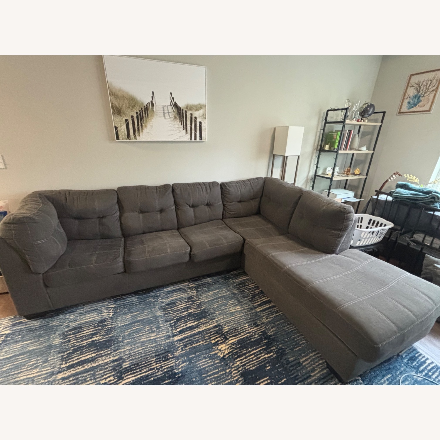 Seller's Notes:3 year old 2 piece sectional couch in good condition. No stains or noticeable blemishes. Slate colored fabric, corner chase is right arm facing, left arm facing sofa.
