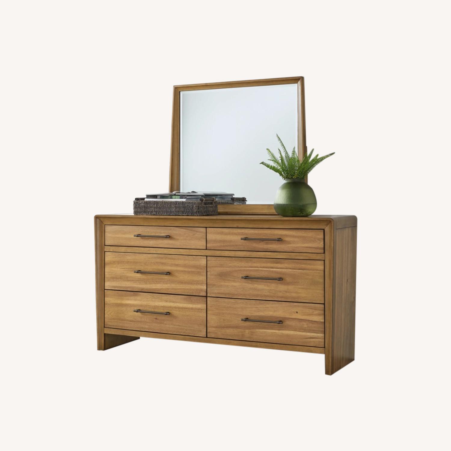 To you, simplicity is the ultimate form of sophistication. With the Takston dresser and mirror, you invest in making everyday life simply beautiful. Emphasizing the stunning look of natural materials, its six storage drawers are a warm, welcoming home for clothing and other essentials. Felt-lined top drawers keep jewelry equally as cozy. This set balances quiet elegance and a fresh boho feel, with a tapered frame adding a forward-thinking take on contemporary design. Includes dresser and mirror Made with hardwood solids, acacia veneer and MDF substrates Finished in a light glazed brown wood tone that enhances the natural beauty of the acacia veneer Drawers with bar pulls 6 drawers with fully finished interior, dovetail construction and ball-bearing side glides (top drawers felt lined) Waterfall edges