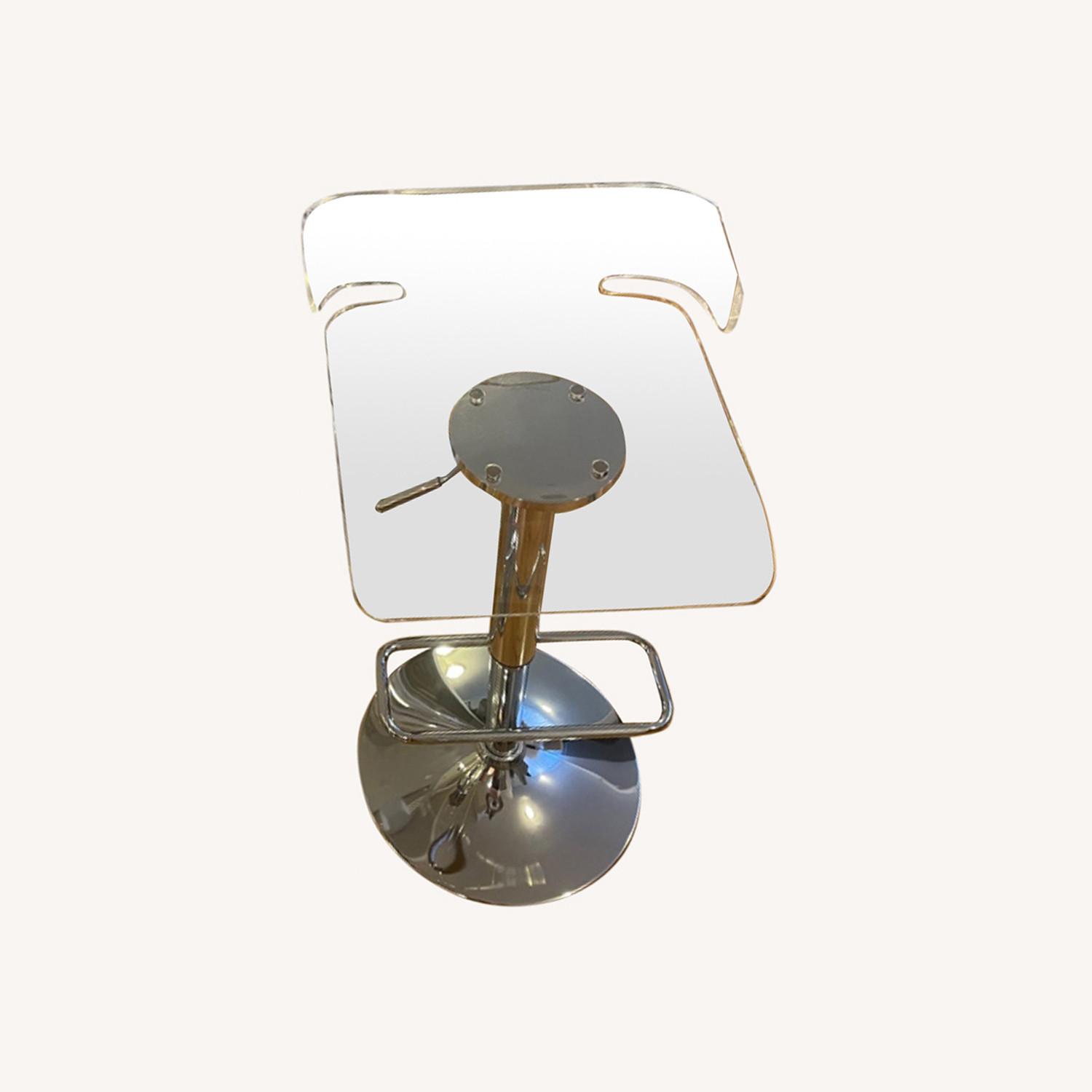 Seller's Notes:Acrylic barstool with a low backrest and a contrasting chrome base. For added comfort and function the adjustable base and swivel function makes this seat perfect for any space. Price negotiable, if interested inquire within. Pick up and delivery are both options.