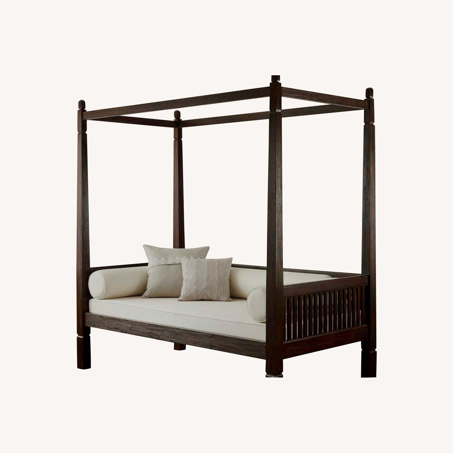 Seller's Notes:Elegant four-poster daybed, designed with a minimalist and rustic charm. Constructed from rich dark wood with clean lines, this sturdy piece features four vertical posts and a striking top structure perfect for curtains. Ideal for adding a sophisticated yet cozy touch to any room. Perfect for lounging or as an extra sleeping space. Don’t miss out on this stylish addition to your home!