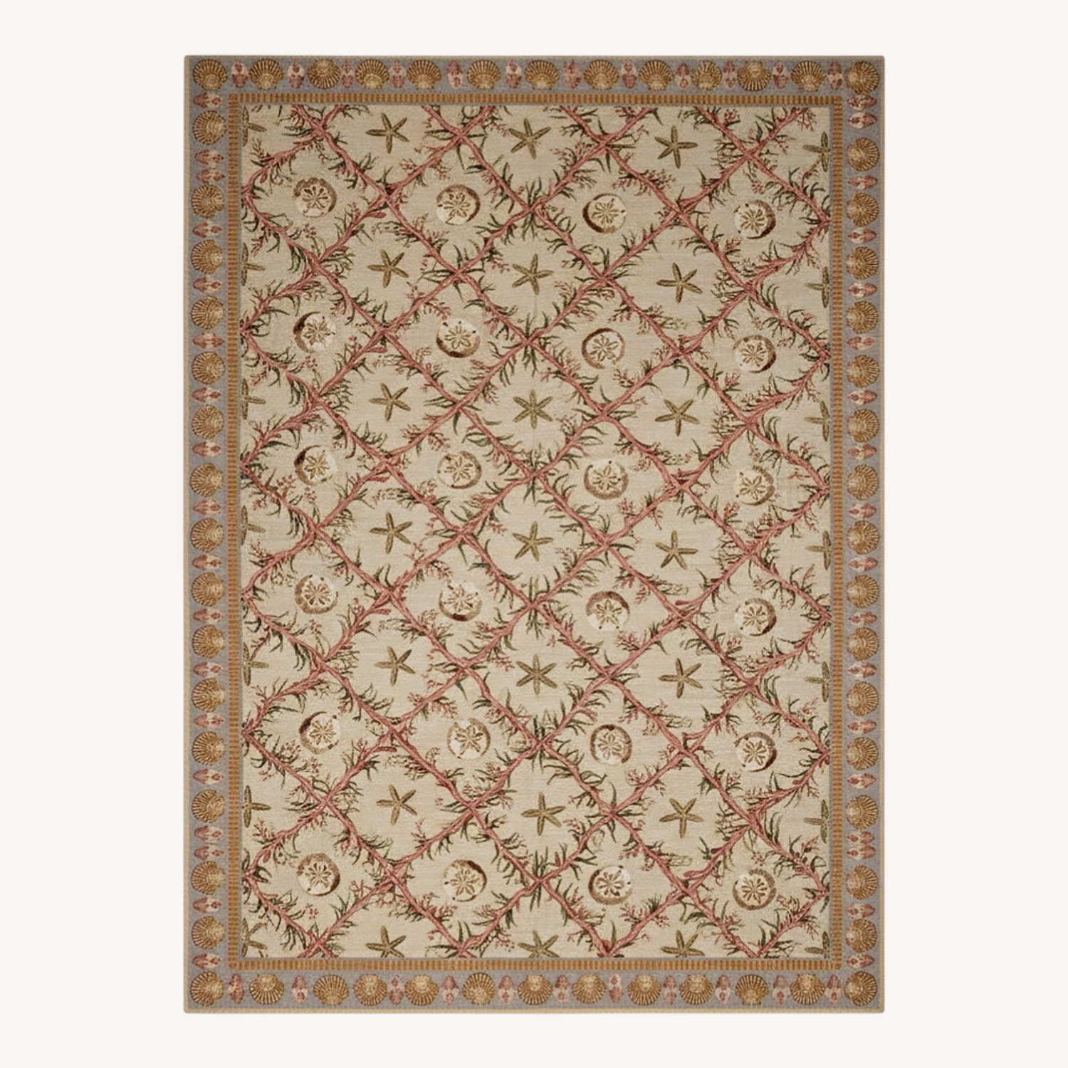 Seller's Notes:120”x 166” seashell themed Needlepoint Rug one inch by one inch stain (pictured) perhaps can come out if professionally cleaned or covered by furniture blends unrecognizable with rug pattern & colors
