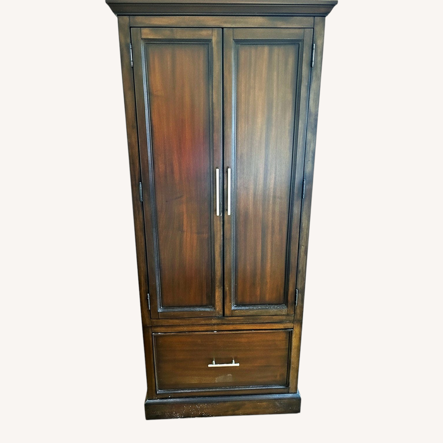 Seller's Notes:Bassett amoire very good condition Hardly used, 4 shelves on interior 2 solid doors no chips, scratches Lower file drawer16”deep with hanging apparatus in place. Very handsome timeless piece used for many storage applications and coordinates with many styles. Purchaser will need to arrange moving the piece fr 5 th fl walk up.