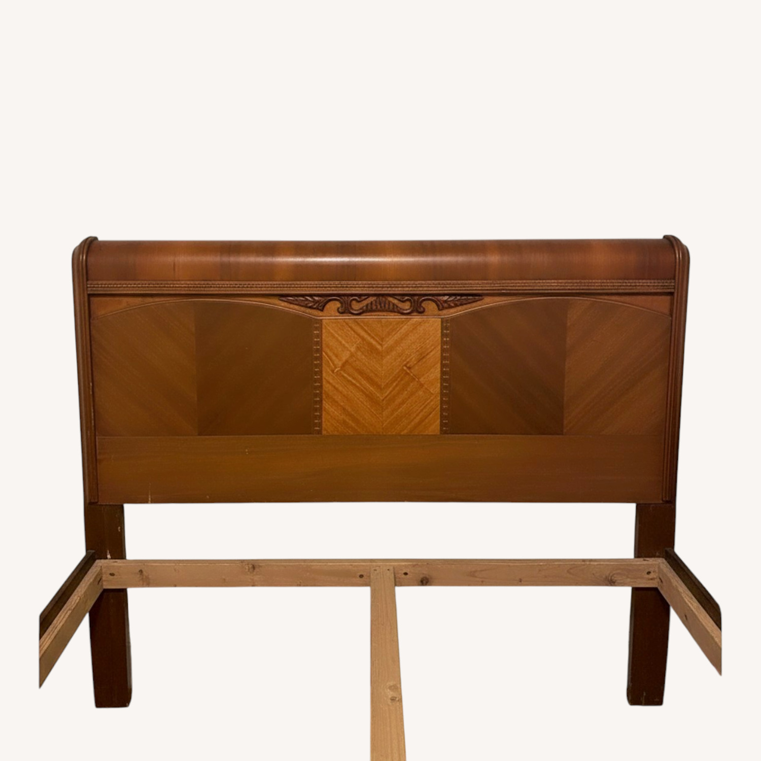 Seller's Notes:1930s Art Deco Antique Waterfall Dresser With Carved Mirror and Double Bed Frame Matching dresser in second post! Beautiful dresser/vanity with carved mirror and double bed frame set with exquisite period details. Condition: very good vintage. Age appropriate wear. This set is a Bassett Mfg Co (see pic of original tag). Mattress, bedding and objects on vanity shown are NOT included. The finish is original and in excellent condition. Some very minor damage to wood paneling on both pieces though surprisingly little for its age, 4 missing square gems on vanity rim, and broken handle on one dresser drawer that could be easily restored. One bed slat needs hardware reinstalled. Only one previous owner who had set since it was purchased in San Francisco in the early 20th century! Dresser: Four deep drawers with Art Deco bakelite handles. Two door lower shelving. Dimensions: Dresser/vanity: 47.5″ W x 20″ D x 74.5″ H. Double bed frame: 80" L Headboard: 56.5" W x 4" D x 42" H. Footboard: 56.5" W x 4" D x 25" H. More photos and video available on request. Can share links for pricing of only the exact dresser (without matching bedframe) elsewhere: $1,898 via Chairish $1,520 via Metro Retro Funriture Similar set sold on Etsy for $3,500