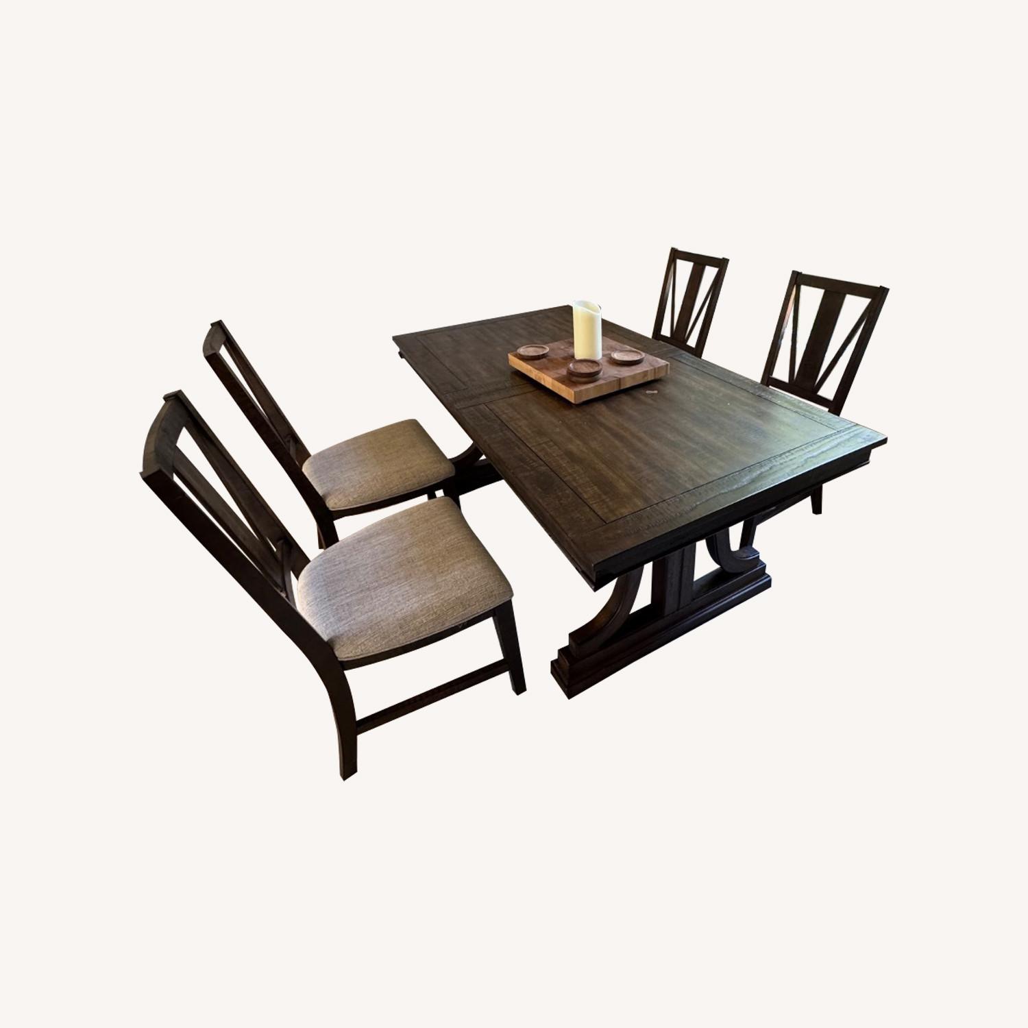 Seller's Notes:Some of the best conversations happen around the dining table, so bring everyone together around the Bay Creek Extendable Dining Table & 4 Chairs in Toasted Nutmeg. Perfect for dinner parties or a board game night, you’ll love having the whole gang in one place. Done in a modern farmhouse style, the Bay Creek Extendable Dining Table & 4 Chairs in Toasted Nutmeg will never look dated. The removable leaf extension means this table can seat just a few, or play host to Christmas dinner. Product Details: • Durably made from pine solids and veneers to last years • Rich chestnut hue looks elegant • Upholstered chairs provide a comfortable seat Dimensions: • Table: 72-90”W x 38”D x 30”H • Chair: 21”W x 20”D x 40”H