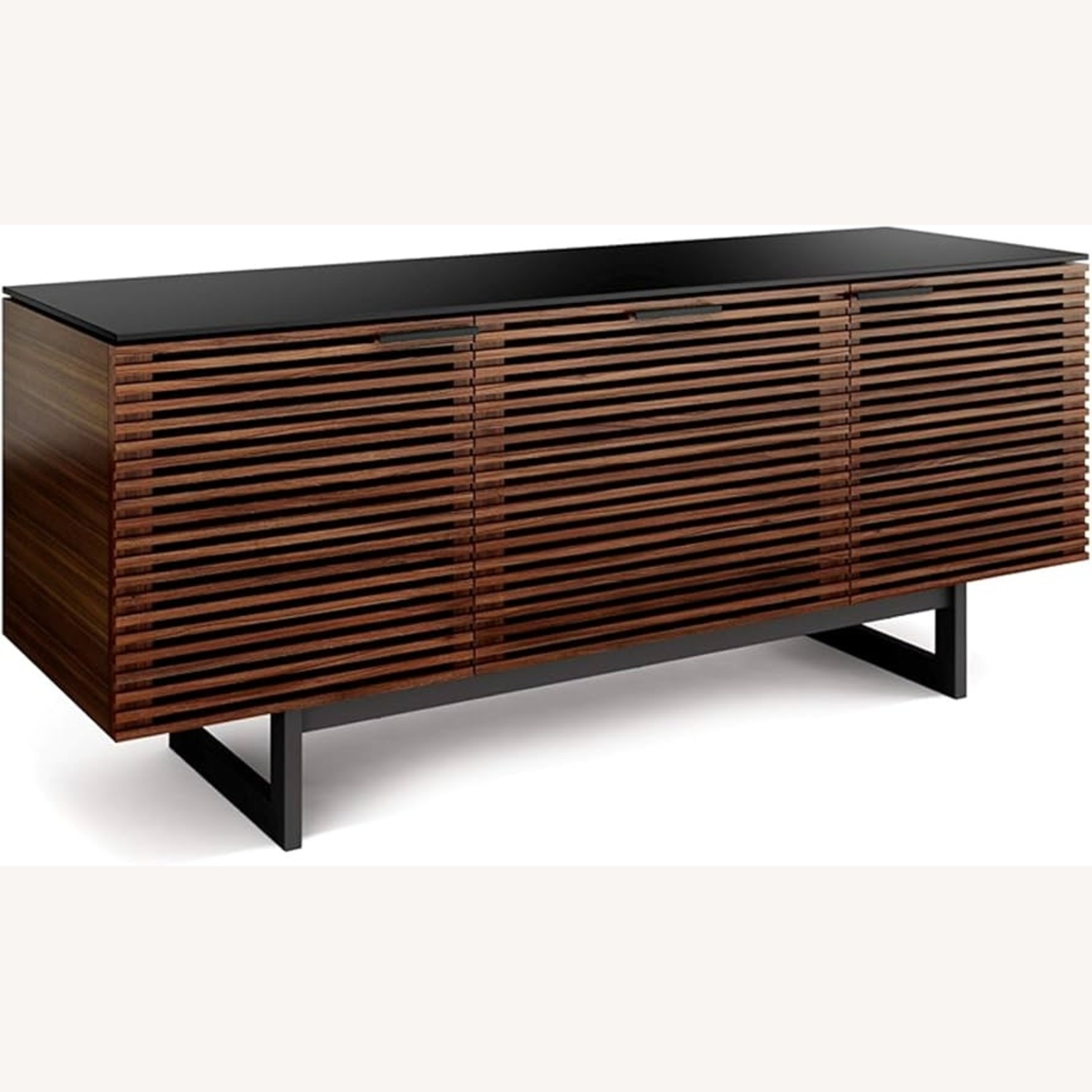 Seller's Notes:The BDI Corridor Walnut TV Stand blends refined modern design with smart media functionality. Crafted with a rich walnut finish, this media console features signature louvered doors that allow sound, airflow, and remote signals to pass through effortlessly—keeping your components hidden yet fully functional.
