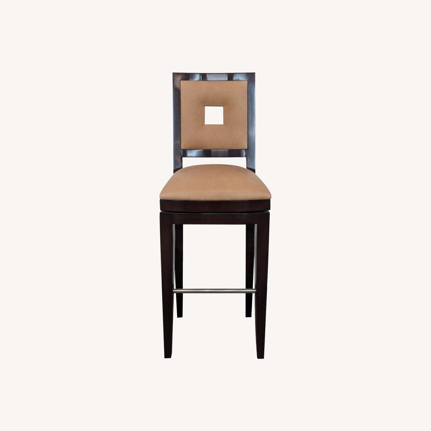 Seller's Notes:Wood stool with stainless steel foot-rest and pebbled leather upholstery