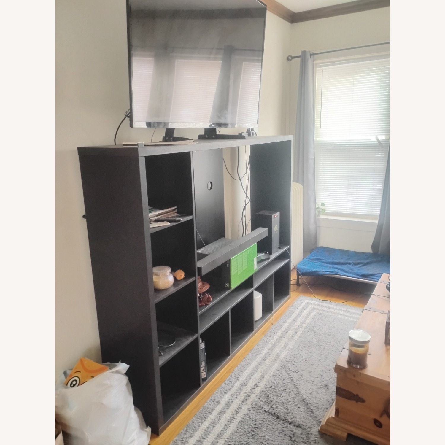 Seller's Notes:Hello, My name is Frank and I have a wooden entertainment center for sale. It measures 72 inches in width and 57 inches in height. It is only three years old! There is ample storage space with eight square cubby areas in an L formation. Right above the lower four square cubby holes are two rectangular storage areas. And above that is the 53 inch tv storage spot. You can place a tv that is 53 inches or smaller if you like. The back end has plenty of openings for cords and other electronic hookups. This is a great piece for someone who likes to decorate or store their movies and books in one place. This center is in nearly perfect shape. It is mark and stain free except for one small area. On the right side near the top surface there are two small scuffs from a white cord outlet. This could be painted over with a small tube of furniture paint if you choose. It is barely noticeable! The tv I got is too big for this piece. I'll be getting a larger one. If you're interested reach out to me! Thank you for your time and have a great day! Sincerely, Frank