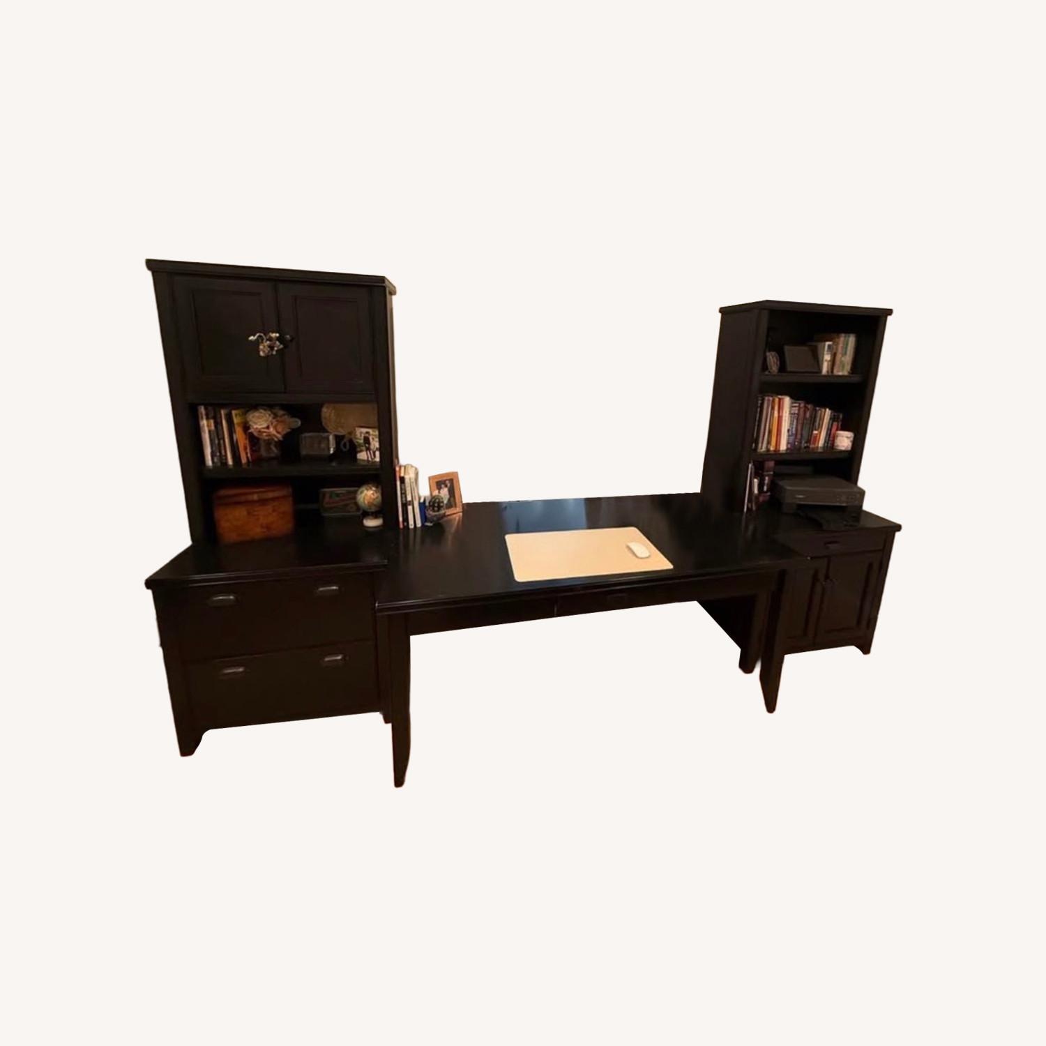 Seller's Notes:Spacious black desk and two matching hutch units. Desk has a center drawer. Left hutch has top cabinets, open shelf, and two file drawers. Right hutch has open shelves and a bottom cabinet with sliding base for easy access. Perfect for home office or study. Minor scratches as see in picture. Very sturdy. Total 5 pieces; 2 bottom cabinets, 2 top shelves and large spacious desk. Individual Dimensions: Desk: 64W x 30D x 29.5H Bottom Cabinets: 30W x 22D x 29.5H Top Selves: 30W x 12D x 41
