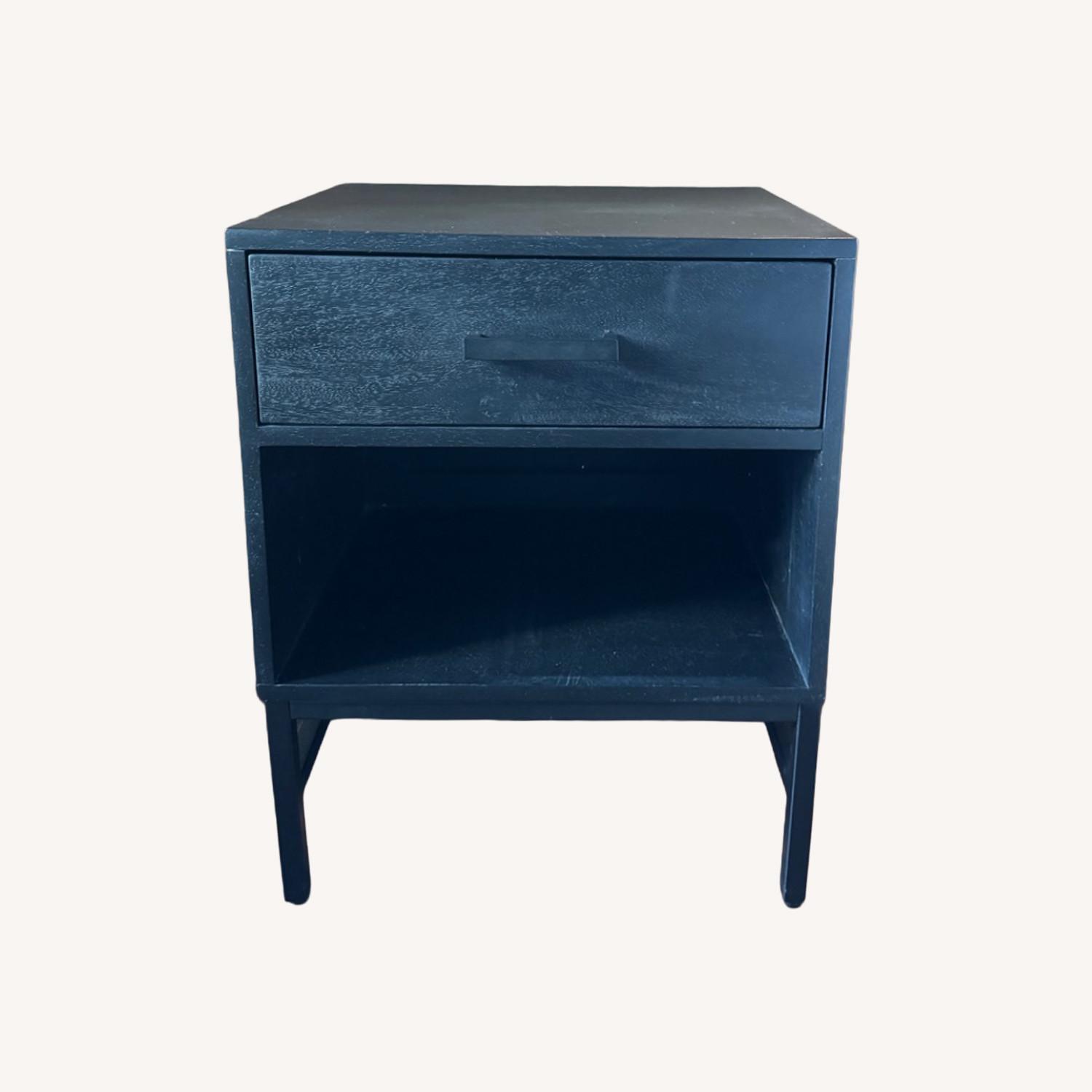 Seller's Notes:Sleek modern nightstands with a matte black finish, clean lines, and minimalist silhouette. Each features a drawer for concealed storage and an open shelf for books or decor. Versatile and timeless—ideal for contemporary, modern, or minimalist bedrooms. • Sold as a set of two • Black wood grain finish • Drawer + open shelf storage • Slim, elevated metal legs • Sturdy construction • Good to excellent condition Simple, functional, and effortlessly stylish.