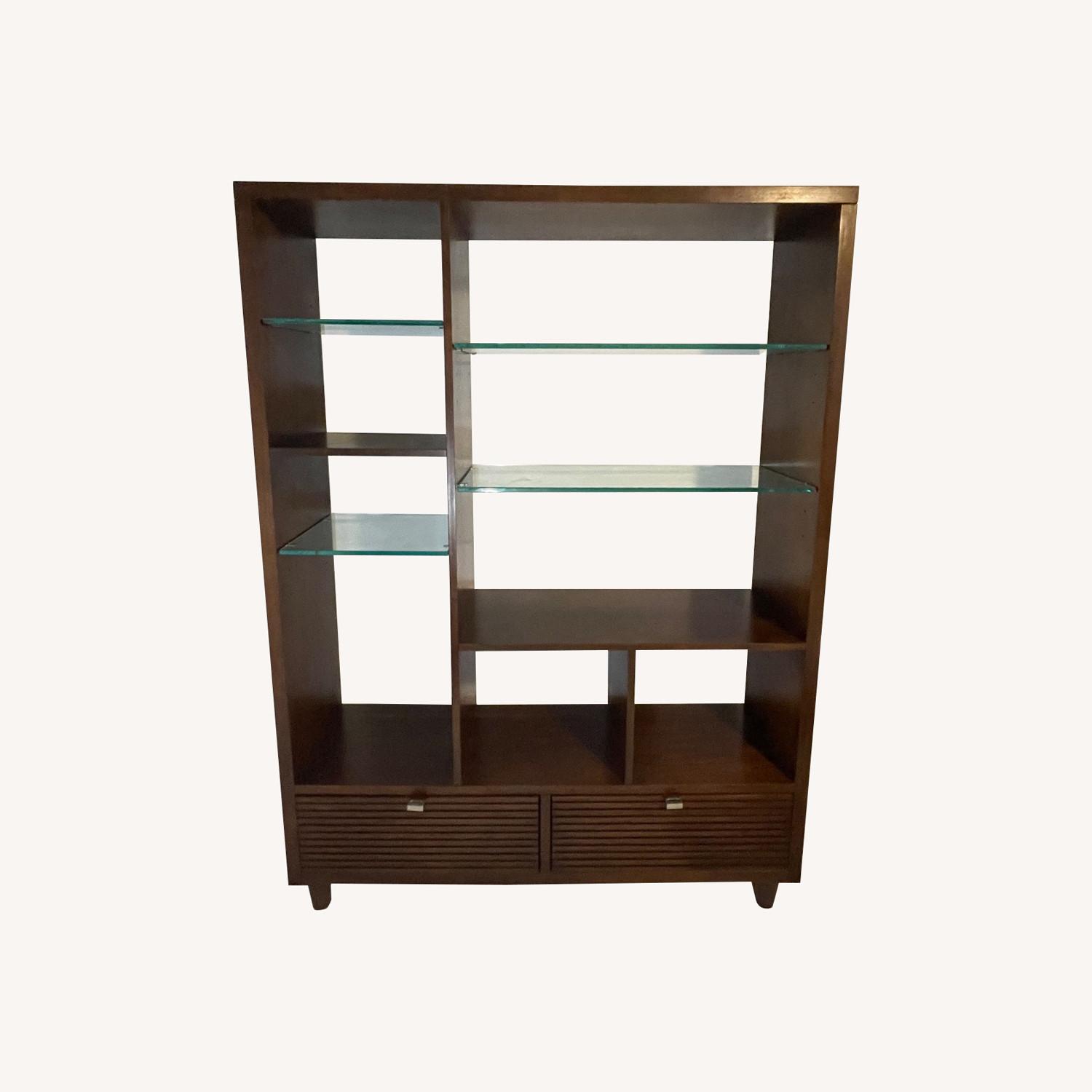 Seller's Notes:Crate and Barrel SIMPLY MODERN BLAKE TOVIN collection Rich dark wood. Decorative display book case. Originally retailed for almost $5000 Double pane thick glass shelves. Beautiful well kept piece. Minor scratches on top corner see photos