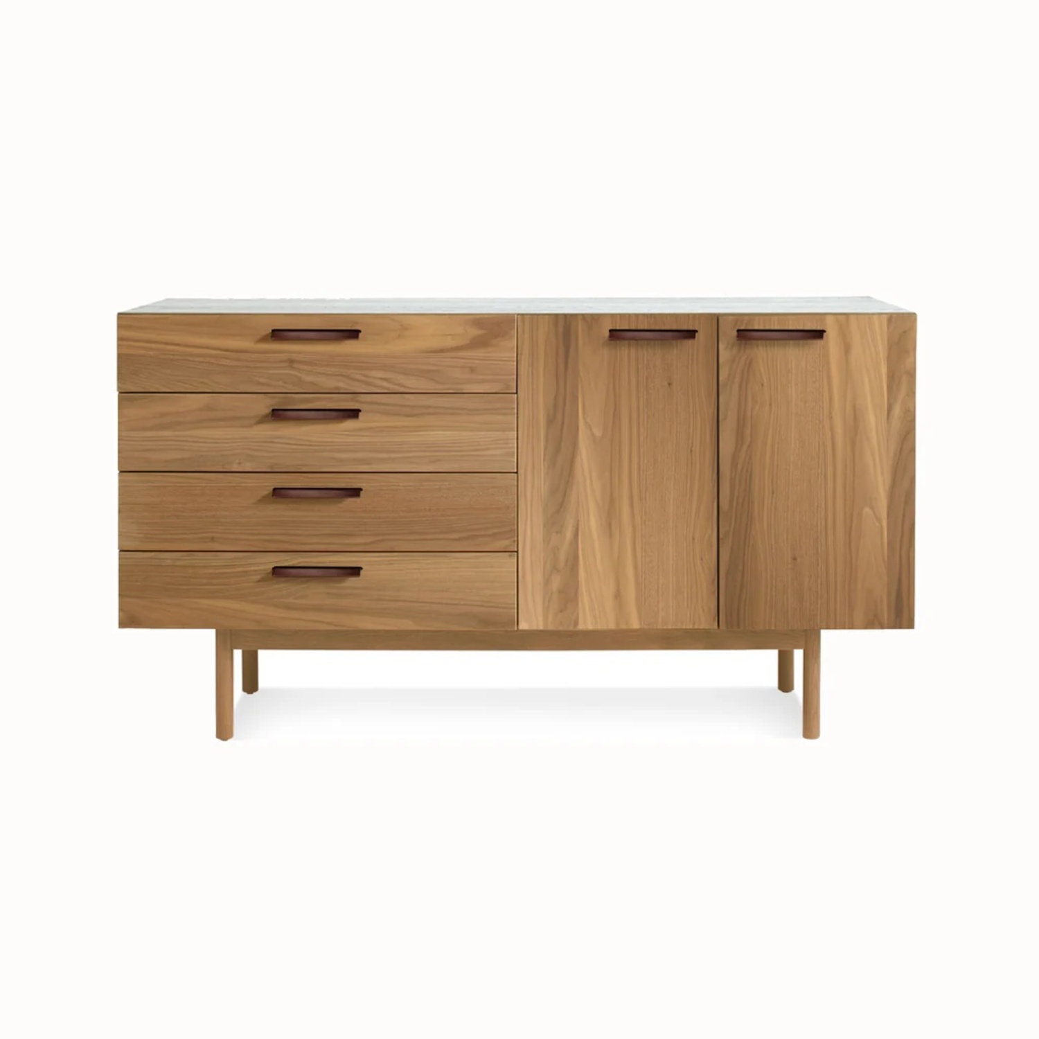 The Shale 4 Drawer/2 Door Credenza by Blu Dot is a clean-lined, modern sideboard. Crafted with beautifully textured walnut or ash and full-grain leather, this simple yet elegant design is a welcome addition to your bedroom, living room, or dining room. Despite being called a four drawer unit, this piece actually has three drawers. The bottom drawer has twice the height to accommodate larger items.