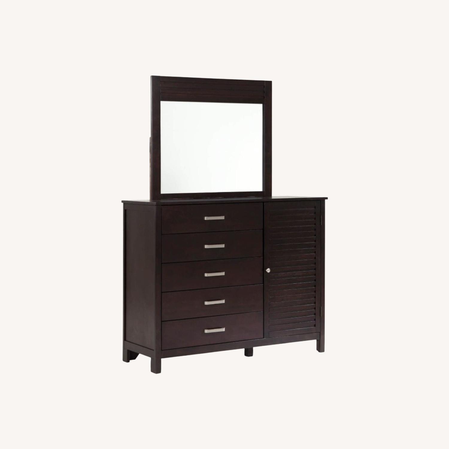 Seller's Notes:Selling an espresso dark wood dresser from Bob’s Discount Furniture. In good condition and comes from a smoke-free, pet-free home. Dresser with Mirror: 5 drawers + cabinet with shelving Brand: Bob's Discount Furniture Collection: Dalton Condition: Minor wear and tear, but still in great condition Overall Dimensions: Width: 55 inches, Height: 46 inches, Depth: 18 inches