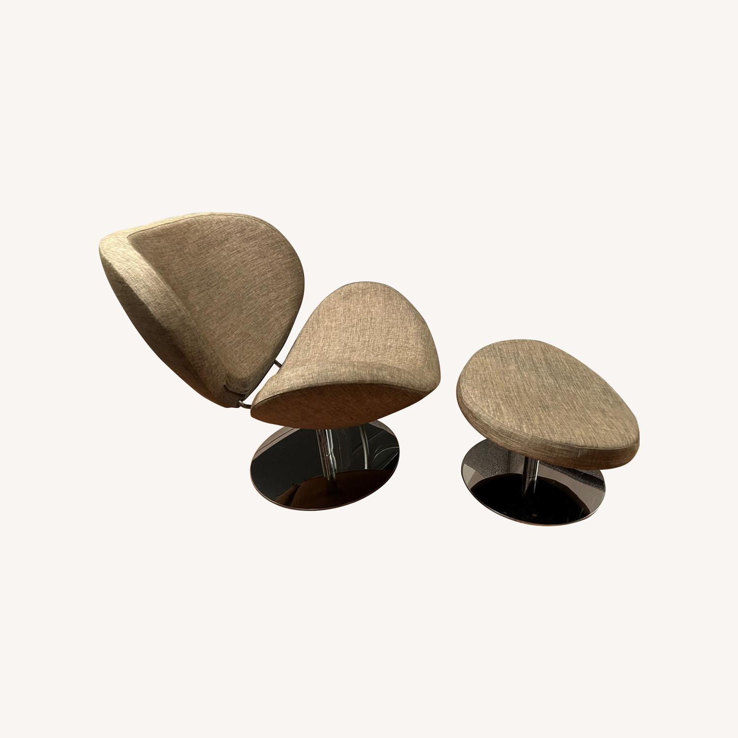 Seller's Notes:Stylish, midcentury modern BoConcept Shelly Armchair with Ottoman for sale. In excellent condition with original fabric. Some minor scuffs on the metal base that are barely noticeable. Chair dimenions: 32.75ʺW × 36.75ʺD × 34.25ʺH; Ottoman dimensions: 15"H x 25.25"W x 19"D