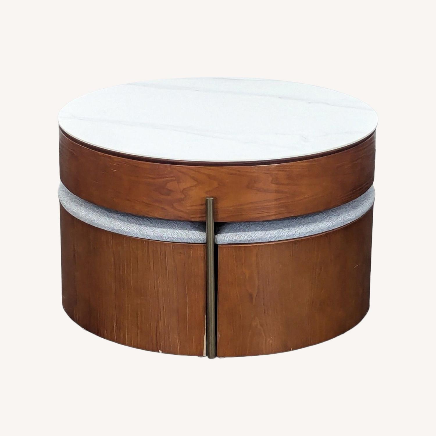 Seller's Notes:"This coffee table has brushed gold stainless steel legs that provide a unique texture. The tabletop utilizes advanced high-tech stone slab technology and is crafted from natural stone for a smooth, natural surface with clear, glossy textures. It is heat-resistant, durable, waterproof, and non-absorbent. The table body is wood veneer. The stools, with storage, feature a cotton linen fabric seat."