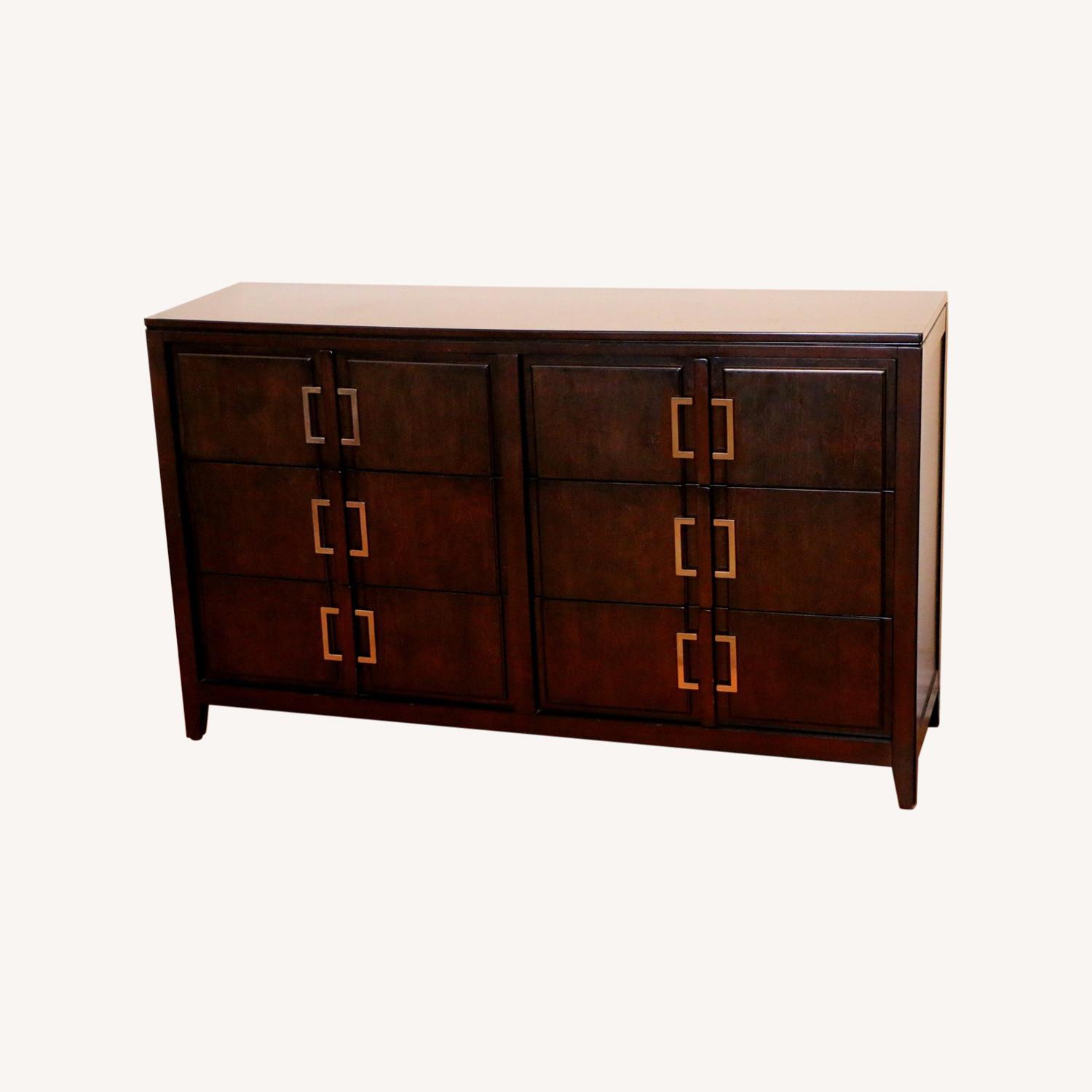 Seller's Notes:Brighton 6 Drawer Buckle Cadence Dresser Merlot Almost new! Minor nicks here and there in a few spots, but overall fantastic condition. Brighton Collection by Samuel Lawrence Made of real wood - no imitation material Merlot finish Metallic accents Buckle inspired custom designed hardware French & English dovetail drawer construction Full extension side ball bearing drawer guides Angle cut feet Dust bottoms 6 Drawers Measures 64" W x 38" T x 18" D