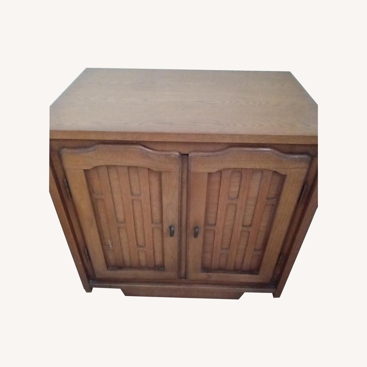 Seller's Notes: Vintage brown wood (solid, sturdy wood) nightstand. The top of the nightstand is pictured above. You can change the pull knobs if you want, as they unscrew easily. The shade of brown is mid range, not very deep dark, but not light. (could ONLY choose dark brown from the choices above) Photos attached here are accurate. Has one sturdy wood shelf, that is the full size of the nightstand.